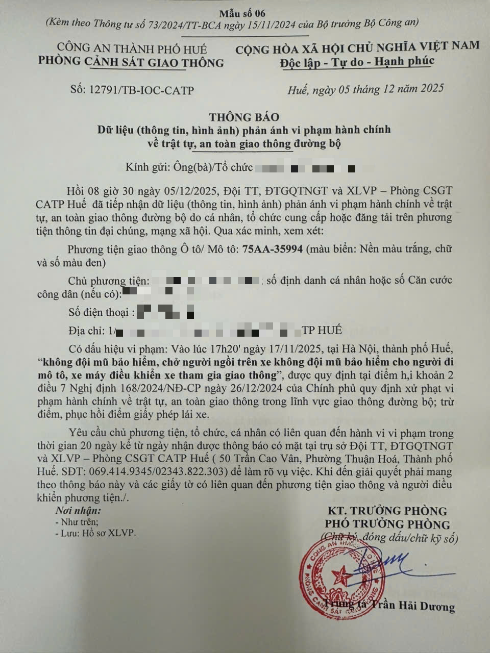 Vấn đề quý Ông/Bà phản ánh, Phòng Cảnh sát giao thông – Công an thành phố Huế xin thông báo kết quả như sau:
