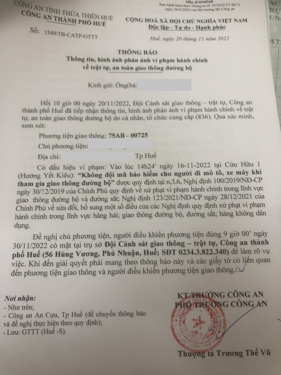 Vấn đề Ông/Bà phản ánh, Công an tỉnh đã chỉ đạo Công an thành phố Huế kiểm tra và xin thông báo kết quả xử lý như sau: