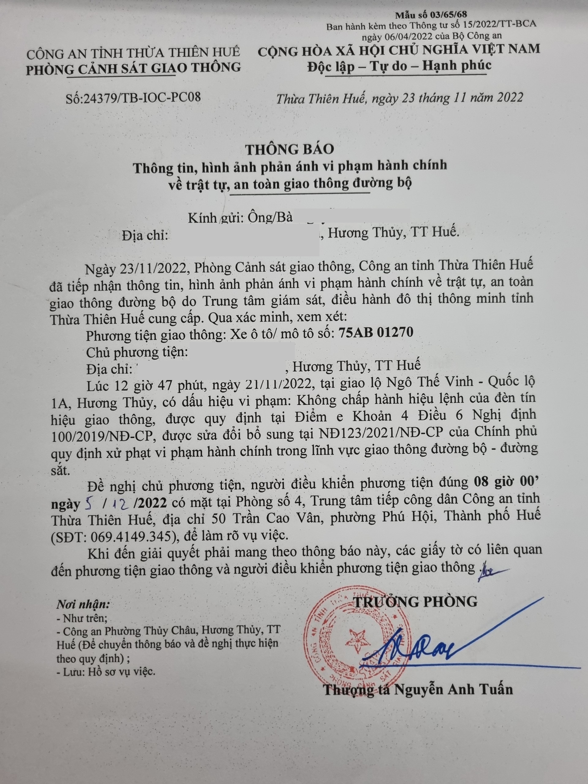 Phòng Cảnh sát giao thông xác định lỗi vi phạm của người điều khiển phương tiện 75AB01270: Không chấp hành hiệu lệnh đèn tín hiệu giao thông, quy định tại điểm e, khoản 4, điều 6 Nghị định 100/2019/NĐ-CP được sửa đổi, bổ sung tại NĐ 123/2021/NĐ-CP.