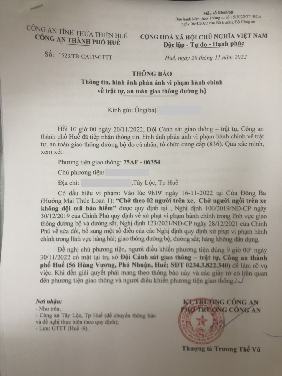 Qua hình ảnh được cung cấp, xác định người điều khiển phương tiện 75AF06354 vi phạm lỗi: “Chở theo 02 người trên xe, Chở người ngồi trên xe không đội “mũ bảo hiểm cho người đi mô tô, xe máy”: (quy định tại điểm l, o Khoản 2,3 Điều 6 Nghị định 100/2019/NĐ-CP, đã được sửa đổi bổ sung tại Nghị định 123/2021/NĐ-CP) Công an thành phố Huế đã gửi thông báo, yêu cầu chủ phương tiện đến làm việc theo quy định. Tuy nhiên, hiện chủ phương tiện vẫn chưa trình diện tại cơ quan. Công an thành phố Huế sẽ tiếp tục thông báo các tổ tuần tra kiểm soát trên địa bàn, trong quá trình làm nhiệm vụ nếu phát hiện sẽ tiến hành dừng xe để xử lý.