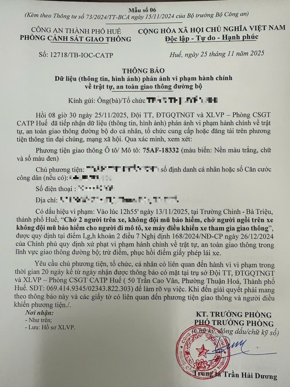 Qua hình ảnh phản ánh, Phòng Cảnh sát giao thông xác định lỗi vi phạm của người điều khiển phương tiện BKS 75AF18332: Chở 02 người trên xe, không đội mũ bảo hiểm, chở người ngồi trên xe không đội mũ bảo hiểm cho người đi mô tô, xe máy điều khiển xe tham gia giao thông, quy định tại điểm i,h,g khoản 2 điều 7 Nghị định 168/2024/NĐ-CP ngày 26/12/2024 của Chính phủ quy định xử phạt vi phạm hành chính về trật tự, an toàn giao thông trong lĩnh vực giao thông đường bộ; trừ điểm, phục hồi điểm giấy phép lái xe.