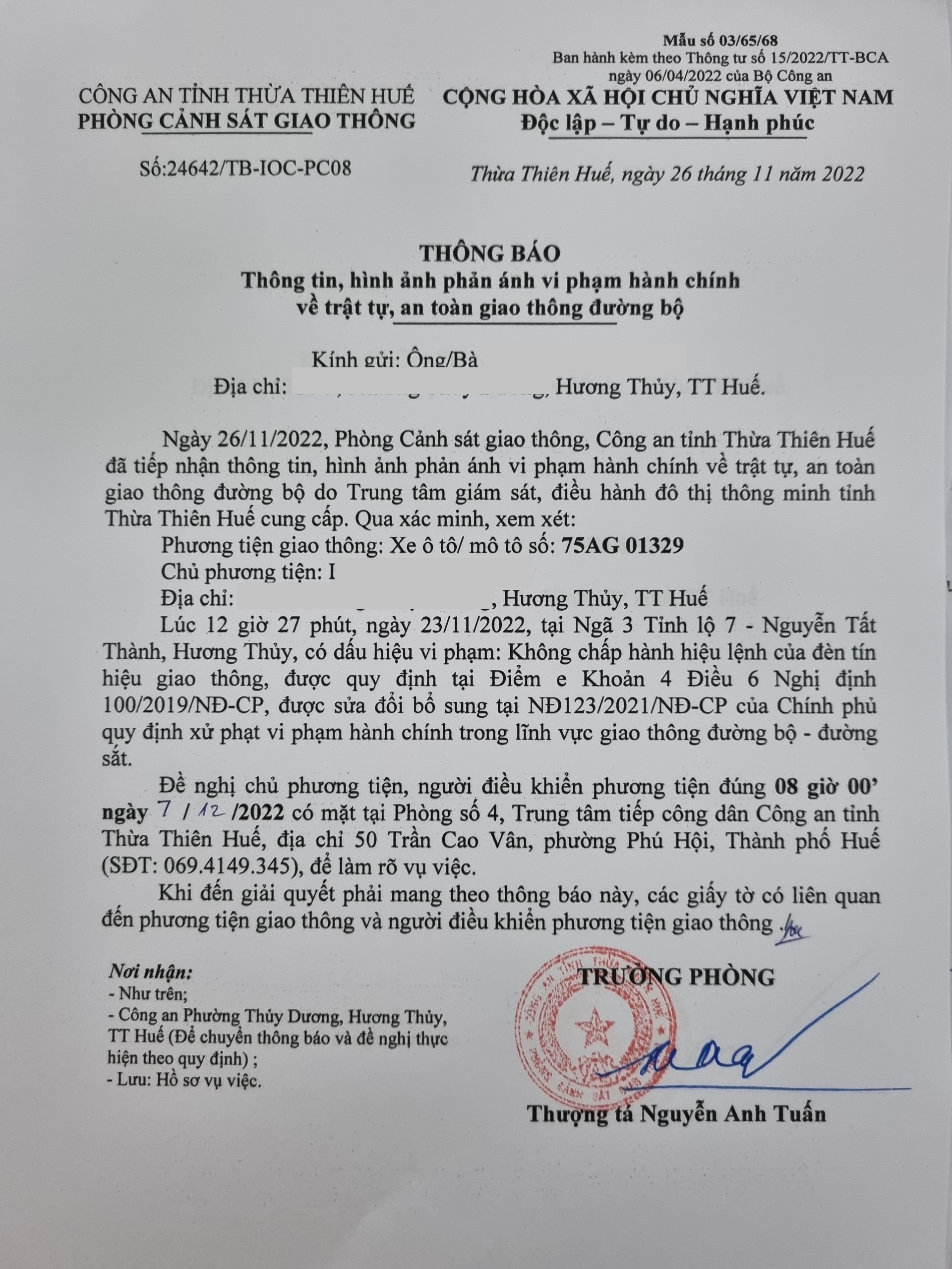 Phòng Cảnh sát giao thông xác định lỗi vi phạm của người điều khiển phương tiện 75AG01329: Không chấp hành hiệu lệnh đèn tín hiệu giao thông, quy định tại điểm e, khoản 4, điều 6 Nghị định 100/2019/NĐ-CP được sửa đổi, bổ sung tại NĐ 123/2021/NĐ-CP.