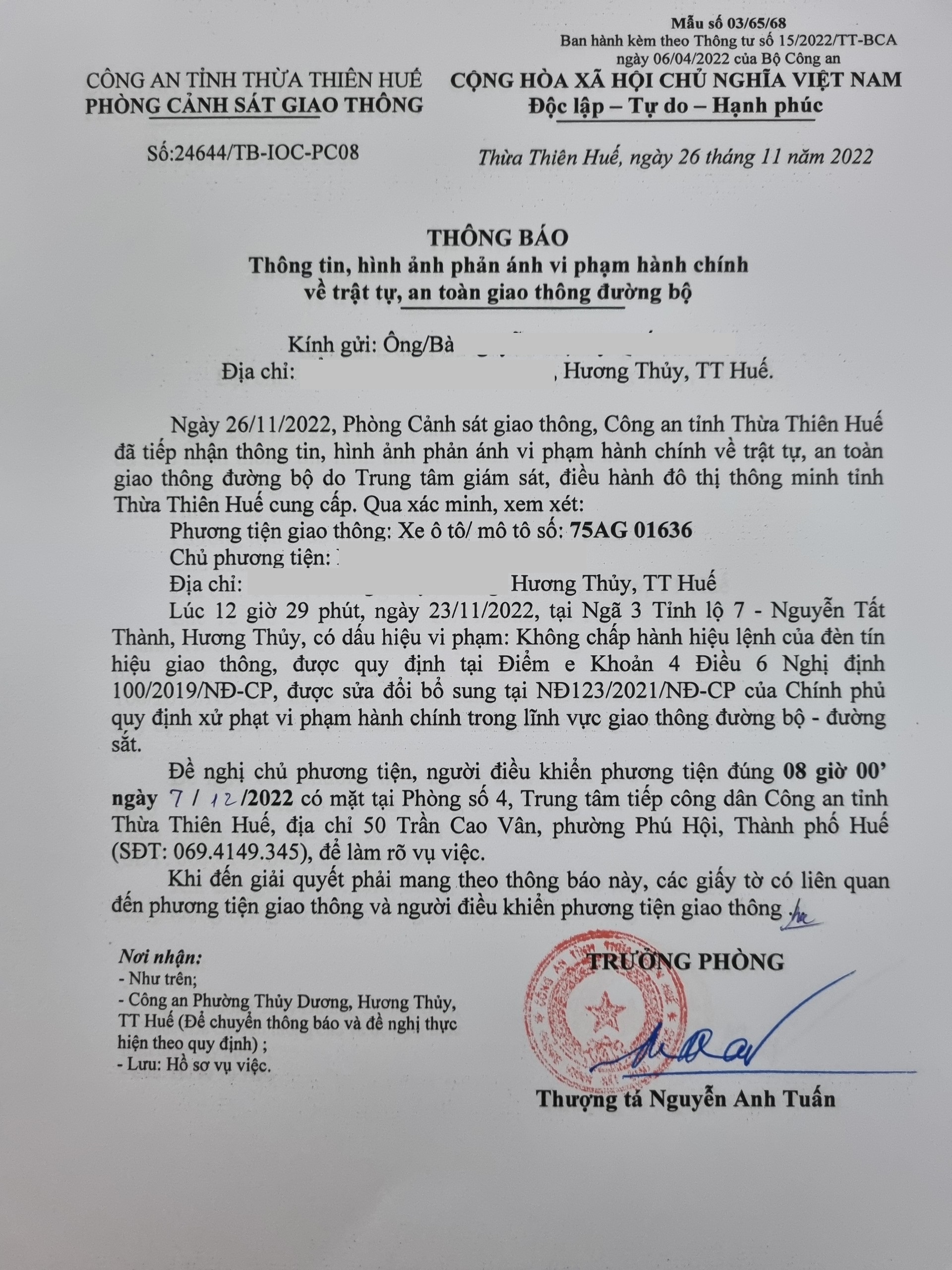 Vấn đề Ông/Bà phản ánh, Công an tỉnh đã chỉ đạo Phòng Cảnh sát giao thông xin thông báo kết quả xử lý như sau: