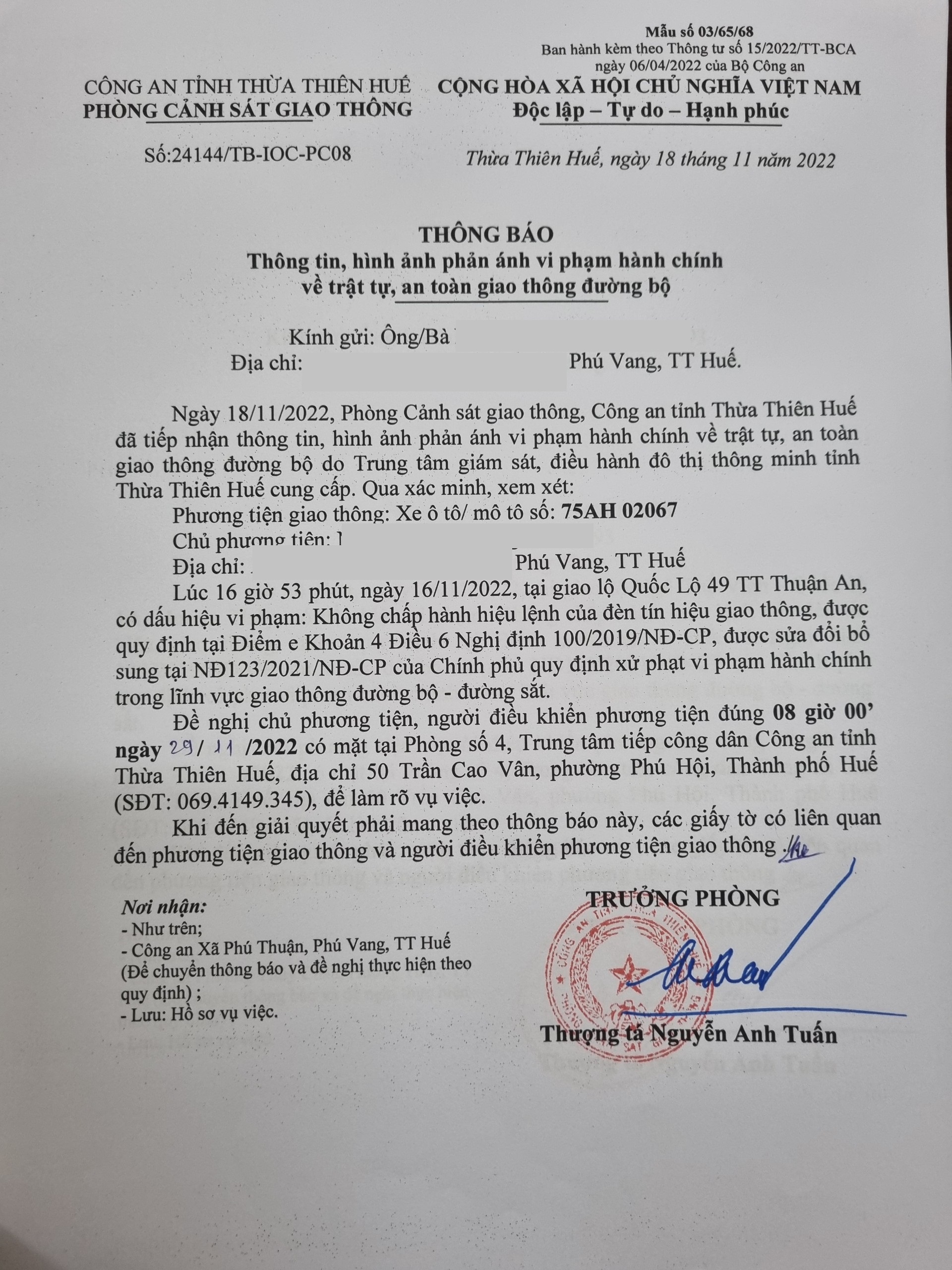 Phòng Cảnh sát giao thông xác định lỗi vi phạm của người điều khiển phương tiện 75AH02067: Không chấp hành hiệu lệnh đèn tín hiệu giao thông, quy định tại điểm e, khoản 4, điều 6 Nghị định 100/2019/NĐ-CP được sửa đổi, bổ sung tại NĐ 123/2021/NĐ-CP.