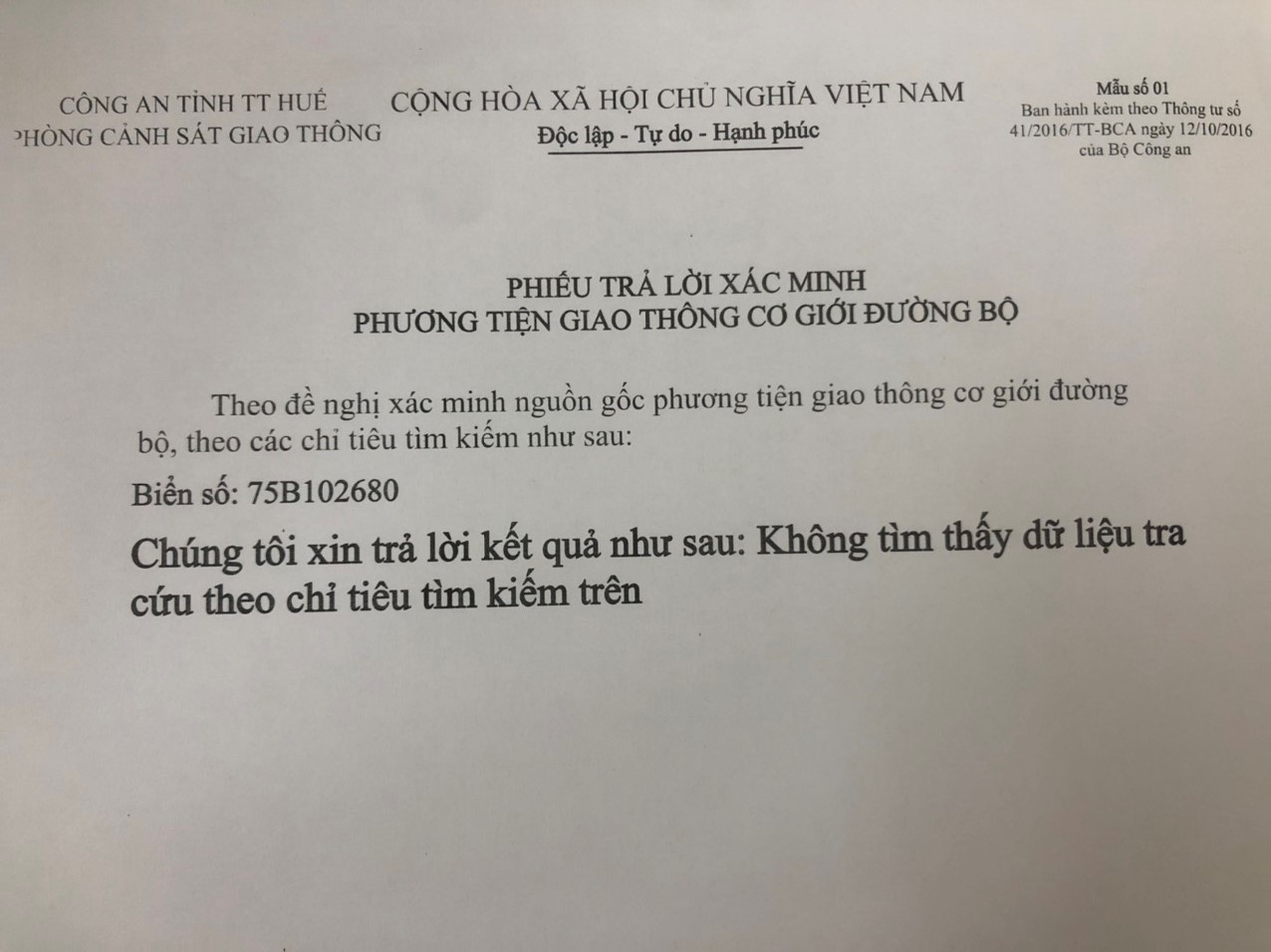 Qua kết quả tra cứu từ hệ thống đăng ký quản lý phương tiện của Bộ Công an không tìm thấy kết quả của phương tiện nói trên, nên không có căn cứ để xử lý trường hợp phản ánh.