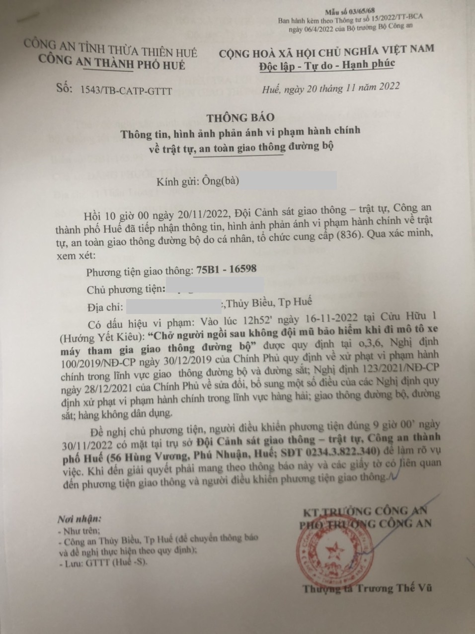 Vấn đề quý Ông/Bà phản ánh, Công an tỉnh đã chỉ đạo Công an thành phố Huế kiểm tra và xin thông báo kết quả xử lý như sau: