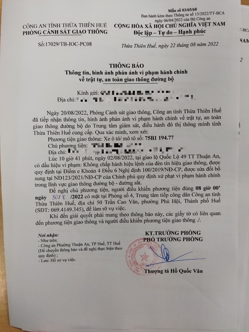 Vào lúc 10 giờ 41 phút, ngày 02/08/2022 Xe máy mang biển kiểm soát 75B119477 Không chấp hành hiệu lệnh của đèn tín hiệu giao thông tại địa điểm QL49 TT Thuận An