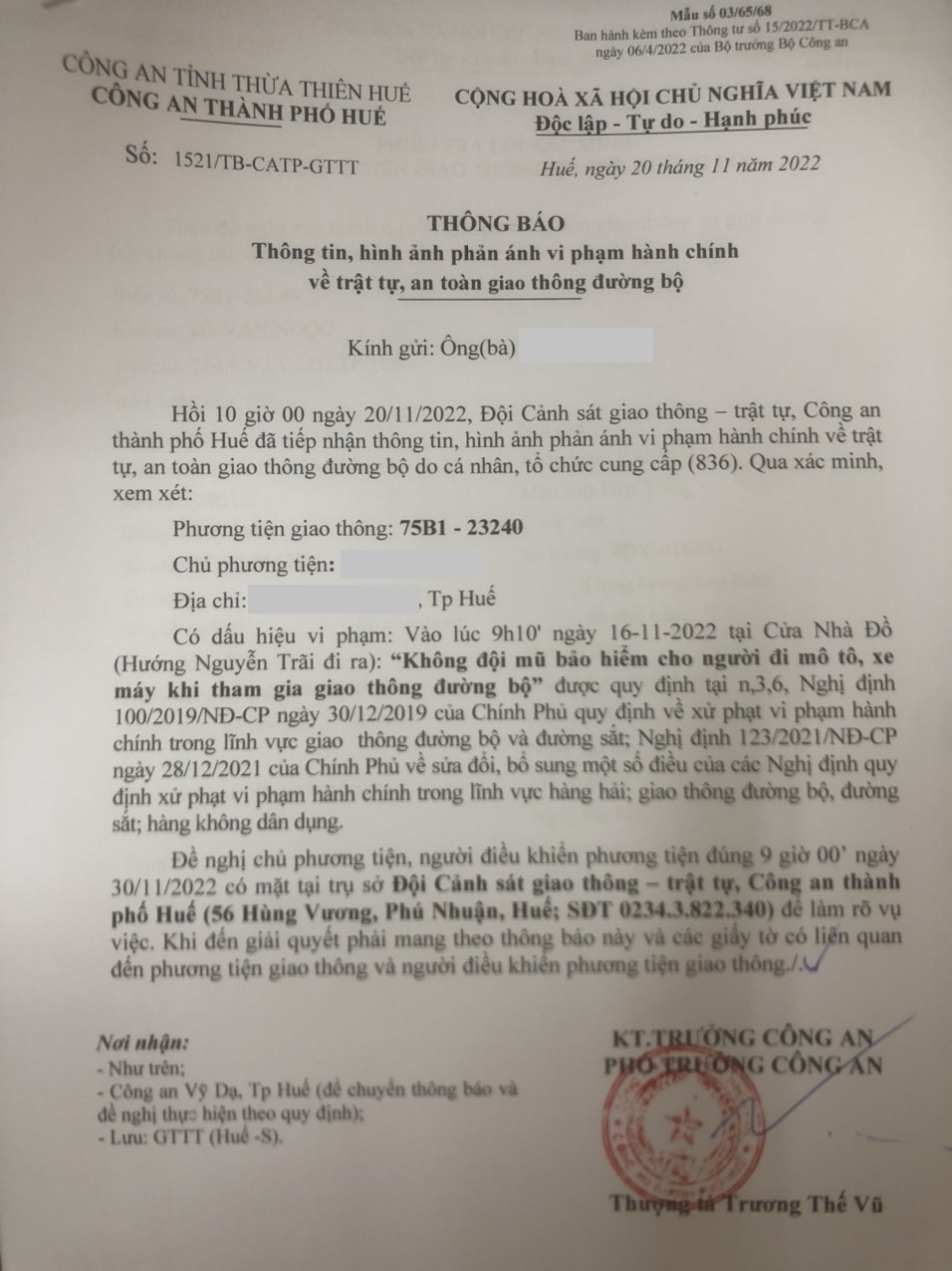 Vấn đề quý Ông/Bà phản ánh, Công an tỉnh đã chỉ đạo Công an thành phố Huế kiểm tra và xin thông báo kết quả xử lý như sau: