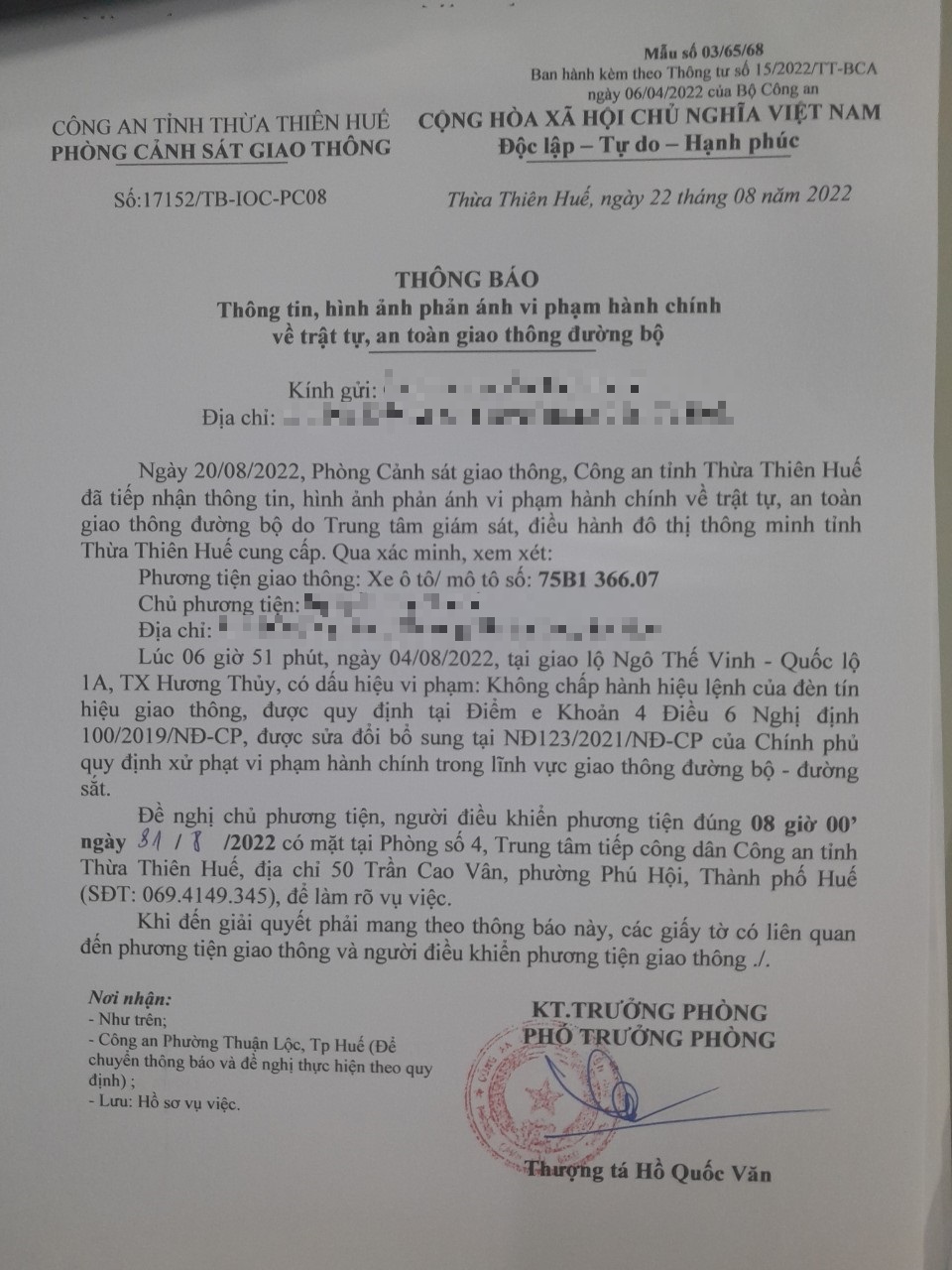 Vào lúc 06 giờ 51 phút, ngày 04/08/2022 Xe máy mang biển kiểm soát 75B136607 Không chấp hành hiệu lệnh của đèn tín hiệu giao thông tại địa điểm Ngô Thế Vinh - QL1A