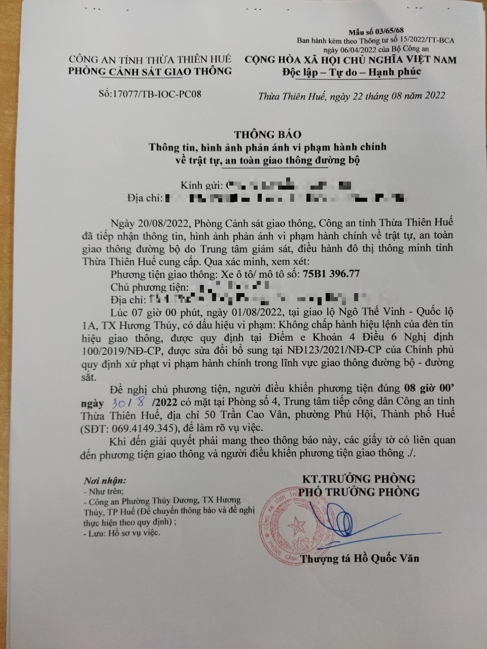 Vào lúc 07 giờ 00 phút, ngày 01/08/2022 Xe máy mang biển kiểm soát 75B139677 Không chấp hành hiệu lệnh của đèn tín hiệu giao thông tại địa điểm Ngô Thế Vinh - QL1A