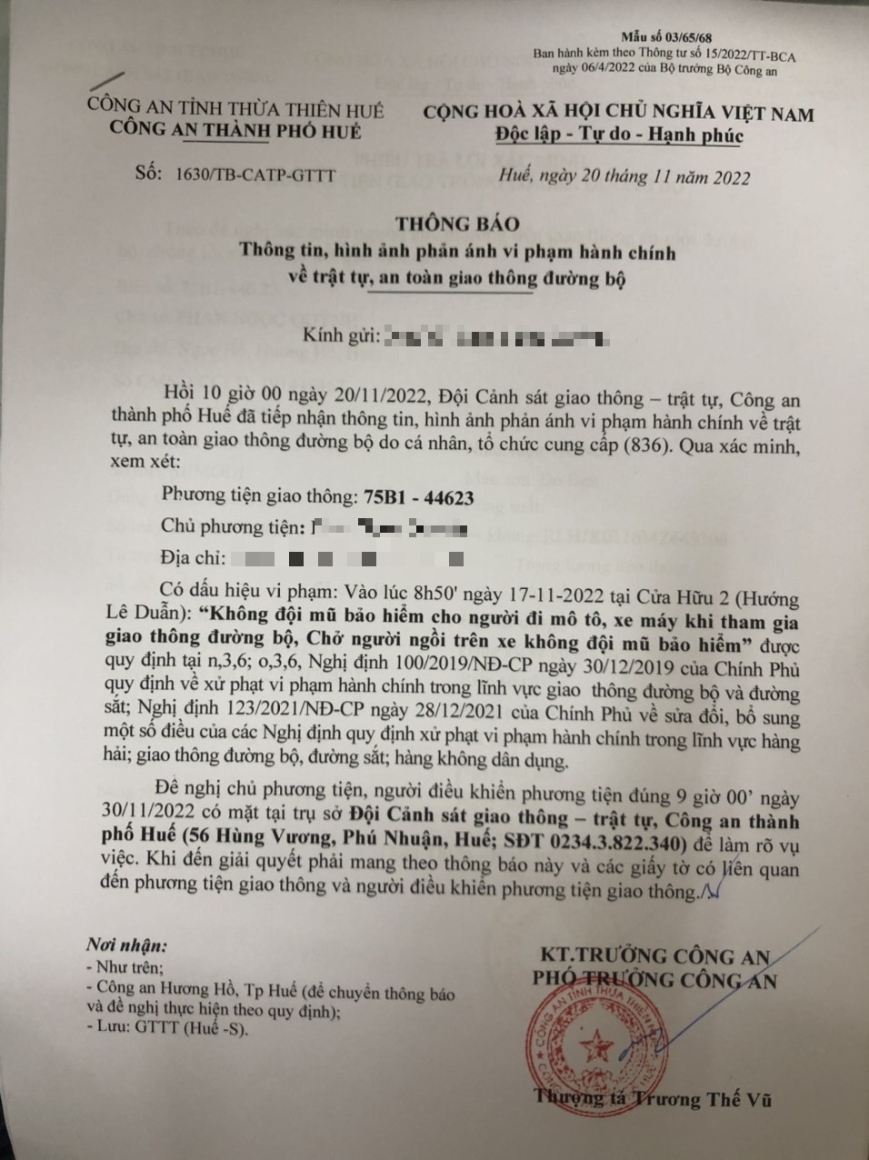 Vấn đề quý Ông/Bà phản ánh, Công an tỉnh đã chỉ đạo Công an thành phố Huế kiểm tra và xin thông báo kết quả xử lý như sau: