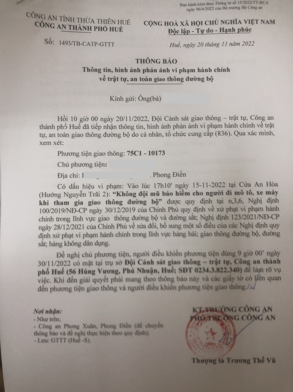 Qua hình ảnh được cung cấp, xác định người điều khiển phương tiện 75C110173 vi phạm lỗi: Không đội "mũ bảo hiểm cho người đi mô tô, xe máy", (quy định tại điểm n, khoản 3, Điều 6 Nghị định 100/2019/NĐ-CP, sửa đổi bổ sung tại Nghị định 123/2021/NĐ-CP). Công an thành phố Huế đã gửi thông báo, yêu cầu chủ phương tiện đến làm việc theo quy định. Tuy nhiên, hiện chủ phương tiện vẫn chưa trình diện tại cơ quan. Công an thành phố Huế sẽ tiếp tục thông báo các tổ tuần tra kiểm soát trên địa bàn, trong quá trình làm nhiệm vụ nếu phát hiện sẽ tiến hành dừng xe để xử lý.