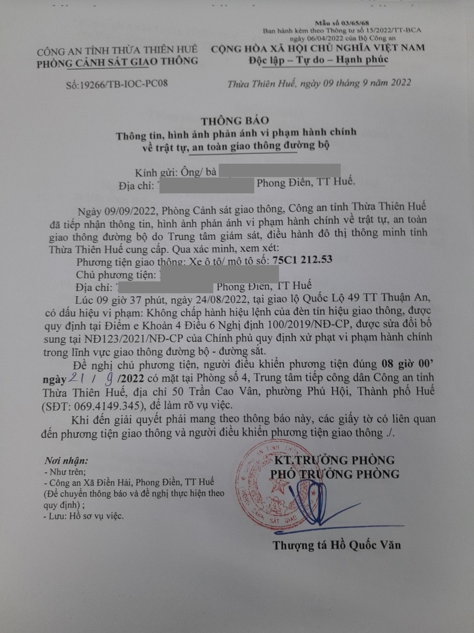 Vào lúc 09 giờ 37 phút, ngày 24/08/2022 Xe máy mang biển kiểm soát 75C121253 Không chấp hành hiệu lệnh của đèn tín hiệu giao thông tại địa điểm QL49 TT Thuận An