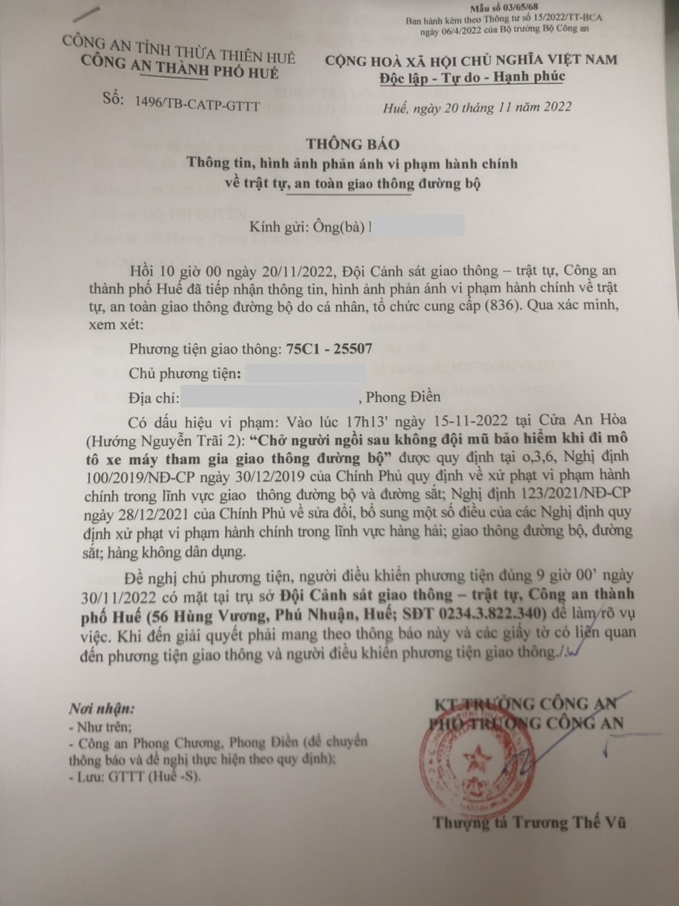 Vấn đề quý Ông/Bà phản ánh, Công an tỉnh đã chỉ đạo Công an thành phố Huế kiểm tra và xin thông báo kết quả xử lý như sau: