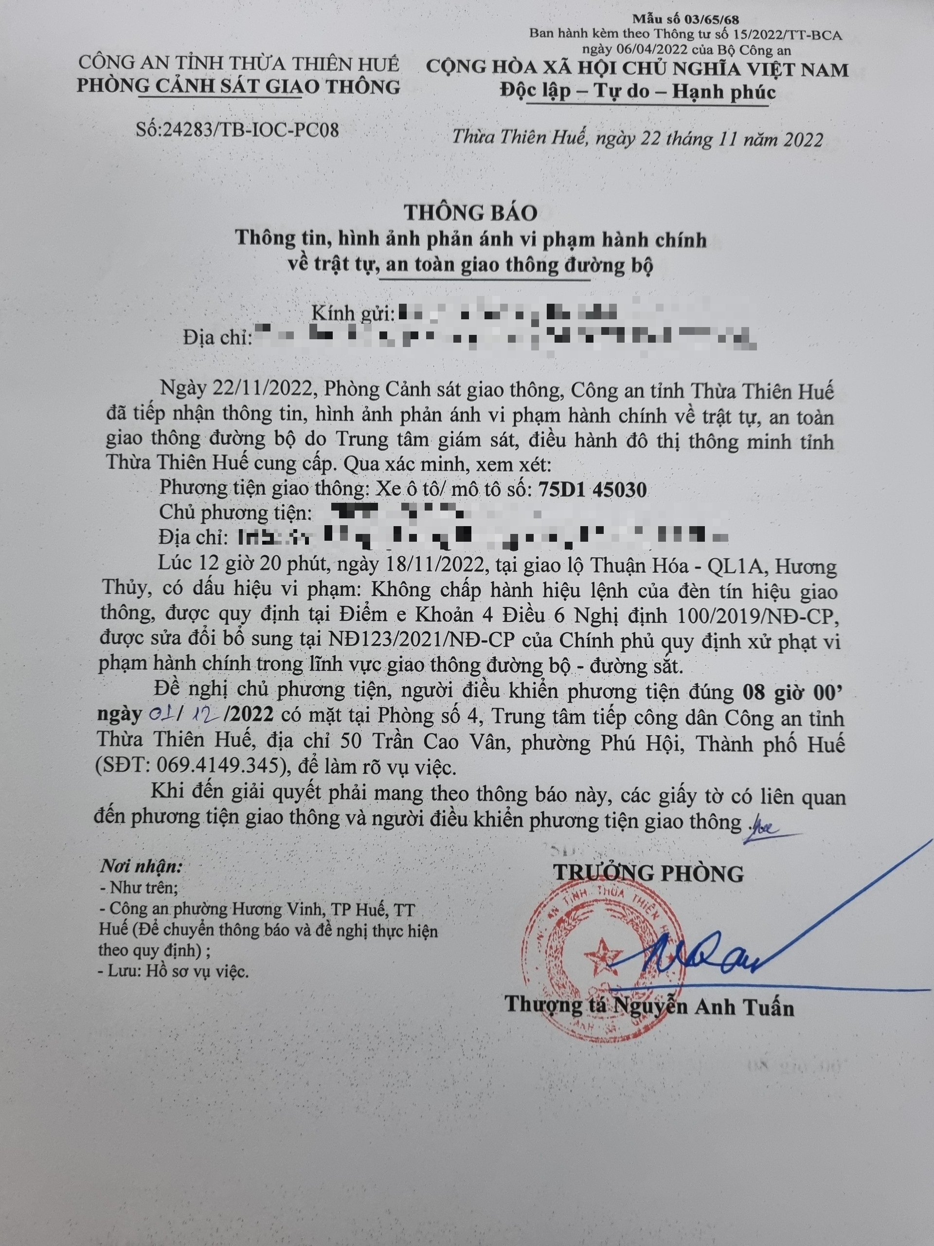 Phòng Cảnh sát giao thông xác định lỗi vi phạm của người điều khiển phương tiện 75D145030: Không chấp hành hiệu lệnh đèn tín hiệu giao thông, quy định tại điểm e, khoản 4, điều 6 Nghị định 100/2019/NĐ-CP được sửa đổi, bổ sung tại NĐ 123/2021/NĐ-CP.
