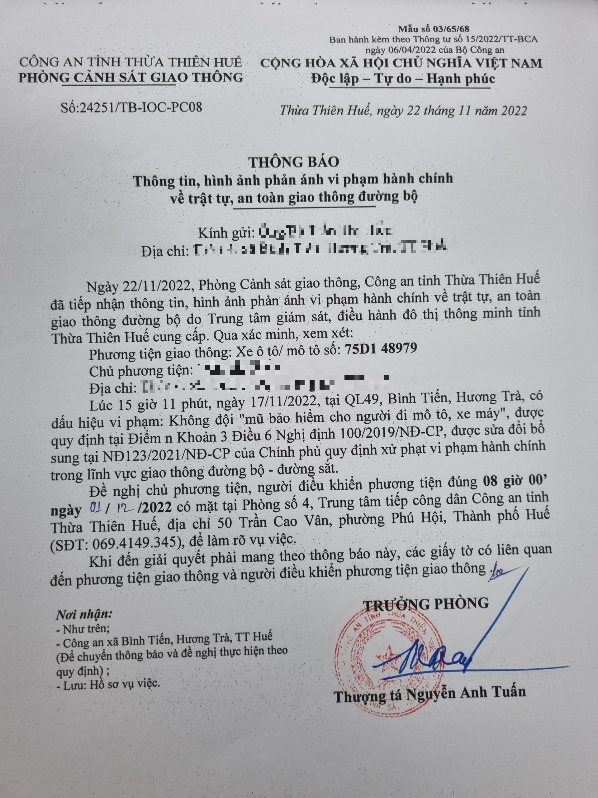 Từ hình ảnh được cung cấp, xác định người điều khiển phương tiện 75D148979 vi phạm lỗi: Không đội “mũ bảo hiểm cho người đi mô tô, xe máy” (quy định tại điểm n, Khoản 3, Điều 6 Nghị định 100/2019/NĐ-CP, sửa đổi tại Nghị định 123/2021/NĐ-CP).