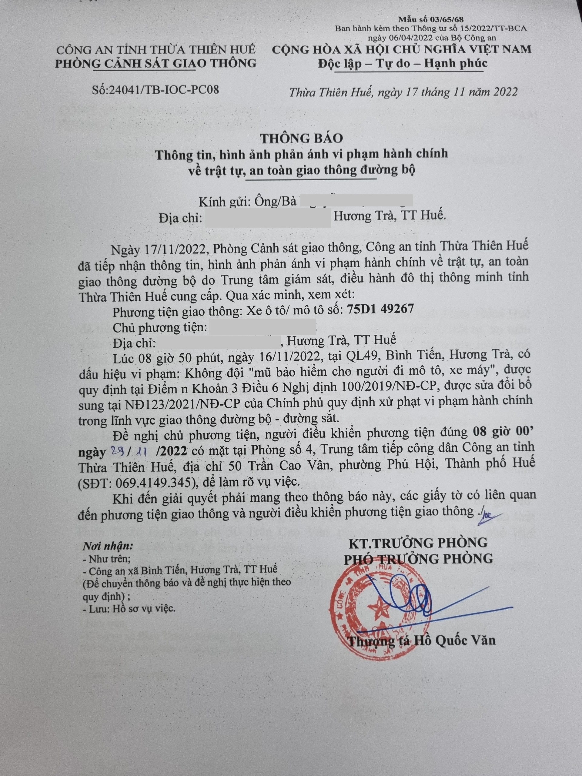 Qua hình ảnh được cung cấp, xác định người điều khiển phương tiện 75D149267 vi phạm lỗi: Không đội "mũ bảo hiểm cho người đi mô tô, xe máy", (quy định tại điểm n khoản 3, Điều 6 Nghị định 100/2019/NĐ-CP, sửa đổi bổ sung tại Nghị định 123/2021/NĐ-CP). Phòng Cảnh sát giao thông đã gửi thông báo, yêu cầu chủ phương tiện đến làm việc theo quy định. Tuy nhiên, hiện chủ phương tiện vẫn chưa trình diện tại cơ quan. Phòng Cảnh sát giao thông sẽ tiếp tục thông báo Công an địa phương nơi chủ phương tiện thường trú; đồng thời, thông báo các tổ tuần tra kiểm soát trên địa bàn, trong quá trình làm nhiệm vụ nếu phát hiện sẽ tiến hành dừng xe để xử lý.
