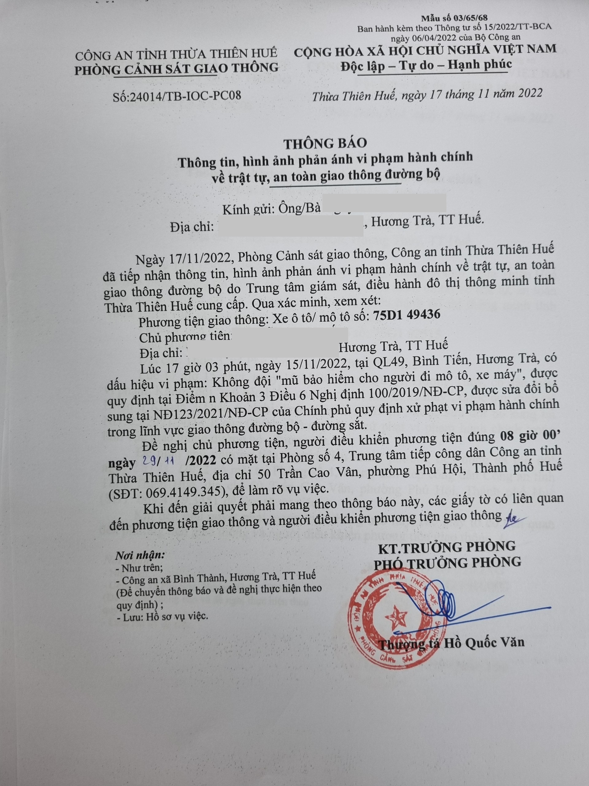 Qua hình ảnh được cung cấp, xác định người điều khiển phương tiện 75D149436 vi phạm lỗi: Không đội "mũ bảo hiểm cho người đi mô tô, xe máy", (quy định tại điểm n khoản 3, Điều 6 Nghị định 100/2019/NĐ-CP, sửa đổi bổ sung tại Nghị định 123/2021/NĐ-CP). Phòng Cảnh sát giao thông đã gửi thông báo, yêu cầu chủ phương tiện đến làm việc theo quy định. Tuy nhiên, hiện chủ phương tiện vẫn chưa trình diện tại cơ quan. Phòng Cảnh sát giao thông sẽ tiếp tục thông báo Công an địa phương nơi chủ phương tiện thường trú; đồng thời, thông báo các tổ tuần tra kiểm soát trên địa bàn, trong quá trình làm nhiệm vụ nếu phát hiện sẽ tiến hành dừng xe để xử lý.