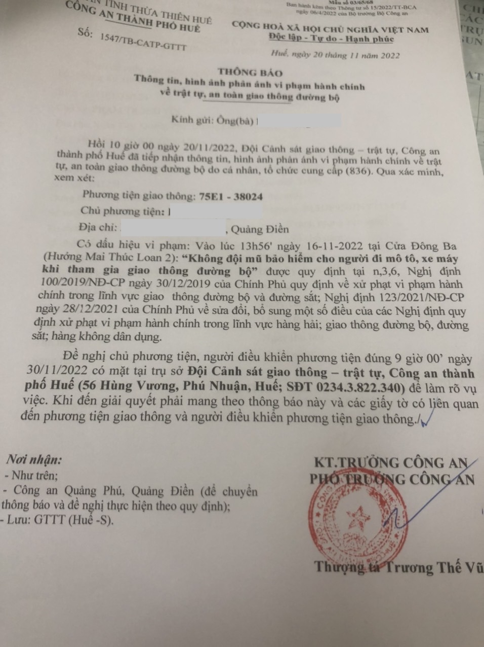 Vấn đề Ông/Bà phản ánh, Công an tỉnh đã chỉ đạo Công an thành phố Huế kiểm tra và xin thông báo kết quả xử lý như sau: