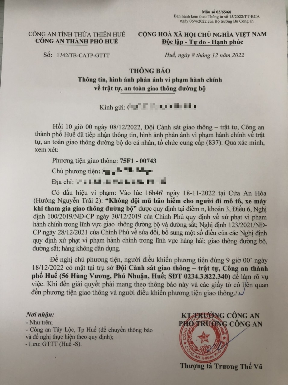 Vấn đề Ông/Bà phản ánh, Công an tỉnh đã chỉ đạo Công an thành phố Huế kiểm tra và xin thông báo kết quả xử lý như sau: