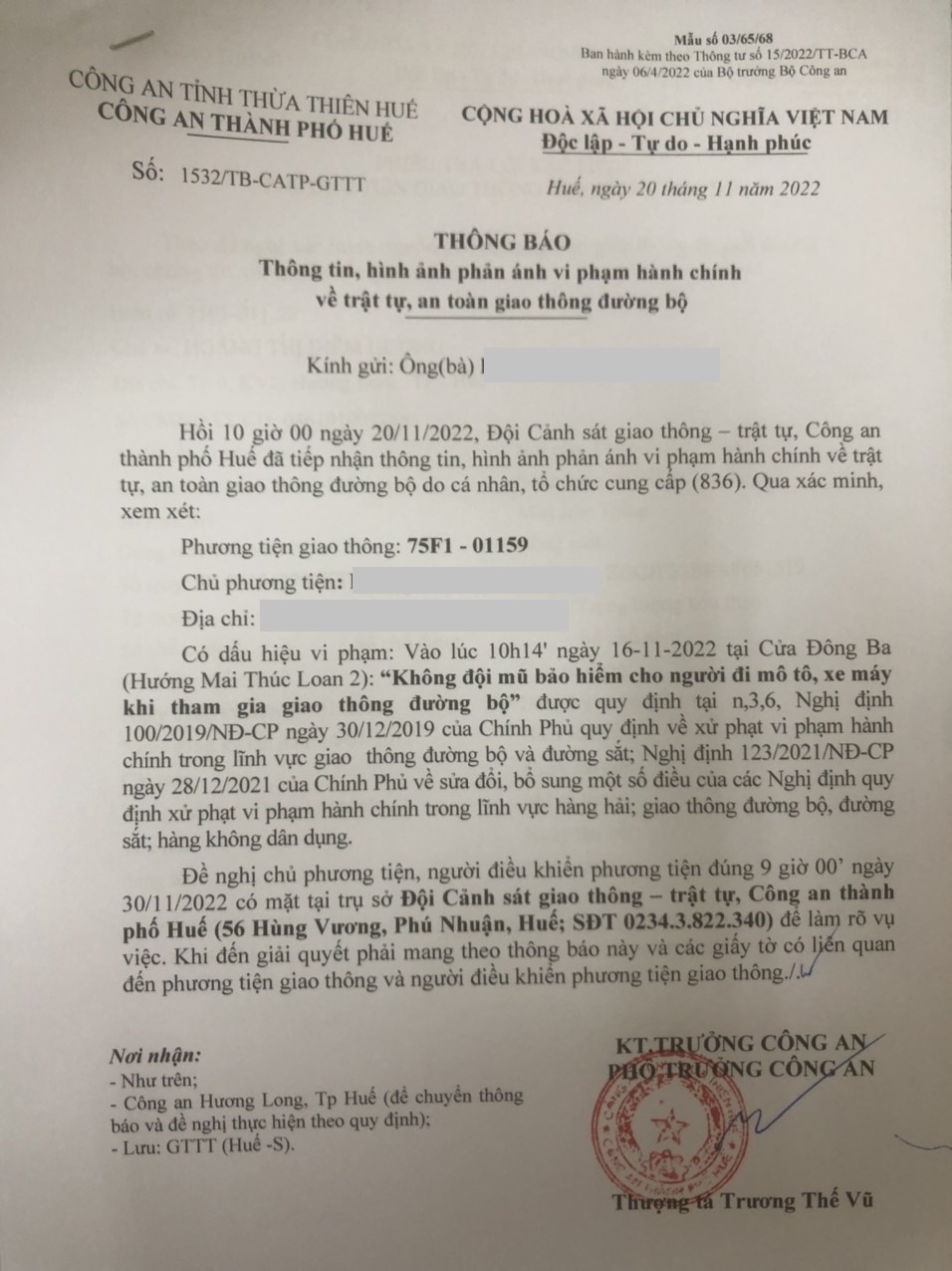 Công an thành phố đã lập hồ sơ, thông báo chủ phương tiện đến làm việc vào ngày 30/11/2022. Tuy nhiên, hiện chủ phương tiện vẫn chưa trình diện tại cơ quan. Công an thành phố Huế sẽ tiếp tục thông báo lực lượng tuần tra trên địa bàn, trong quá trình làm nhiệm vụ phát hiện, xử lý.