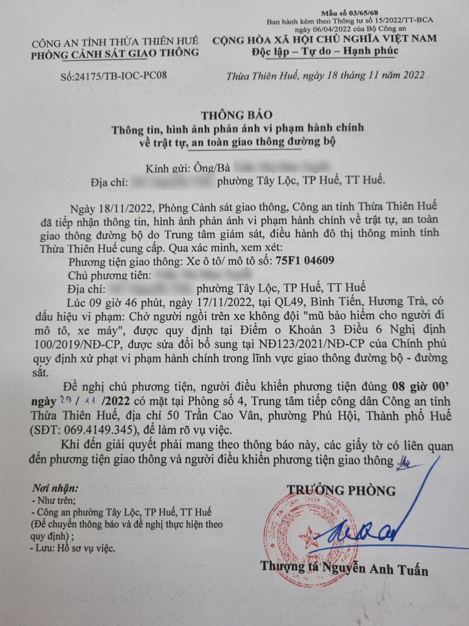 Qua hình ảnh được cung cấp, xác định người điều khiển phương tiện 75F104609 vi phạm lỗi: Chở người ngồi trên xe không đội "mũ bảo hiểm cho người đi mô tô, xe máy" (quy định tại điểm o, khoản 3, Điều 6 Nghị định 100/2019/NĐ-CP, sửa đổi bổ sung tại Nghị định 123/2021/NĐ-CP). Phòng Cảnh sát giao thông đã gửi thông báo, yêu cầu chủ phương tiện đến làm việc theo quy định. Tuy nhiên, hiện chủ phương tiện vẫn chưa trình diện tại cơ quan. Phòng Cảnh sát giao thông sẽ tiếp tục thông báo Công an địa phương nơi chủ phương tiện thường trú; đồng thời, thông báo các tổ tuần tra kiểm soát trên địa bàn, trong quá trình làm nhiệm vụ nếu phát hiện sẽ tiến hành dừng xe để xử lý.