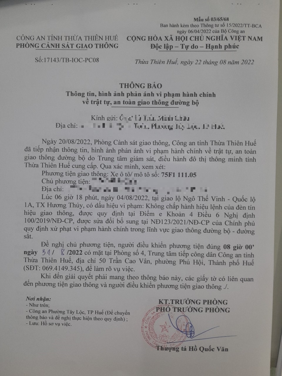 Vào lúc 06 giờ 18 phút, ngày 04/08/2022 Xe máy mang biển kiểm soát 75F111105 Không chấp hành hiệu lệnh của đèn tín hiệu giao thông tại địa điểm Ngô Thế Vinh - QL1A