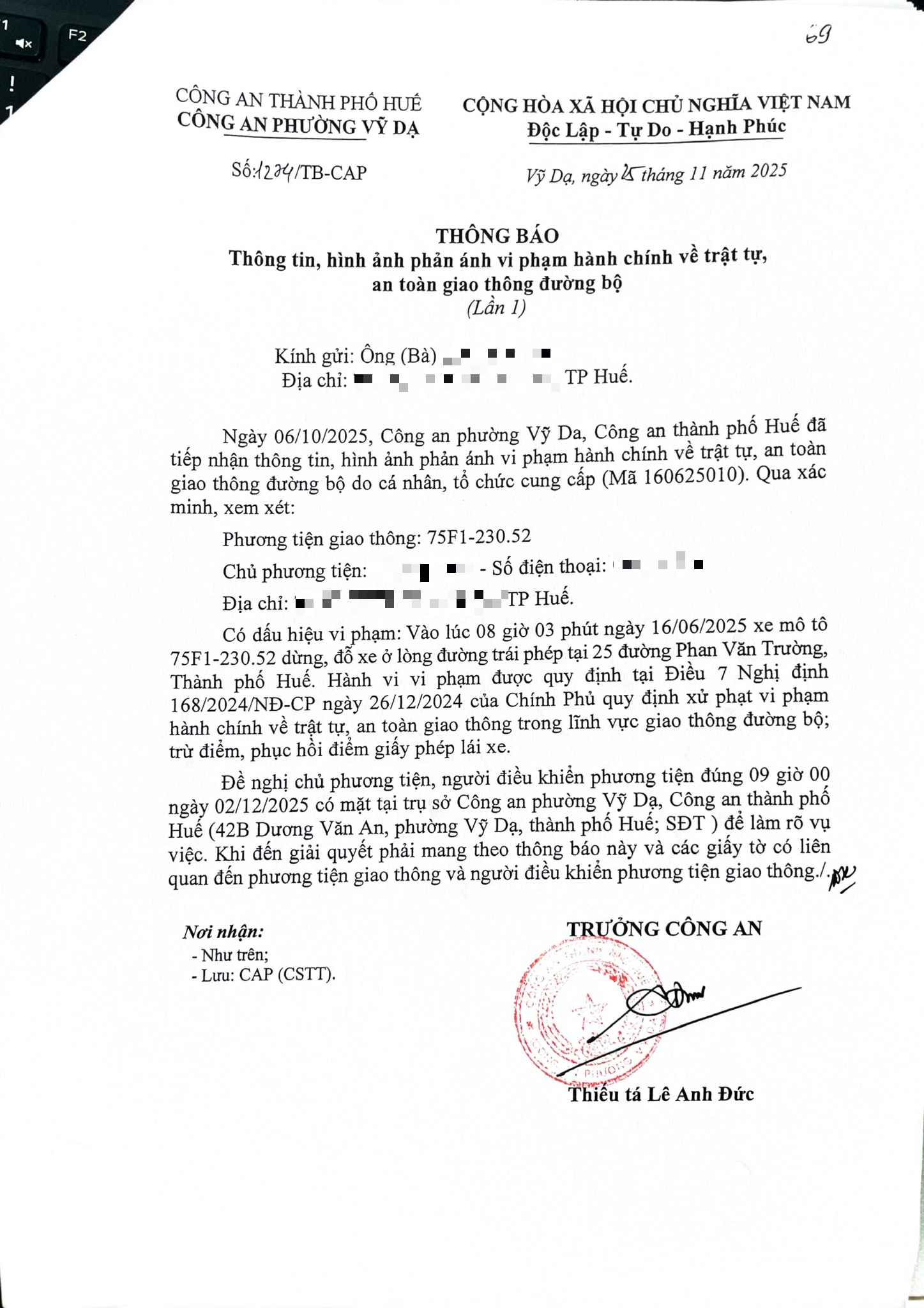 Công an phường Vỹ Dạ đã lập hồ sơ, thông báo chủ phương tiện đến làm việc. Tuy nhiên hiện chủ phương tiện vẫn chưa trình diện tại cơ quan. Công an phường Vỹ Dạ sẽ tiếp tục tăng cường thực hiện công tác tuần tra trên địa bàn, kịp thời phát hiện, xử lý các hành vi vi phạm theo quy định.