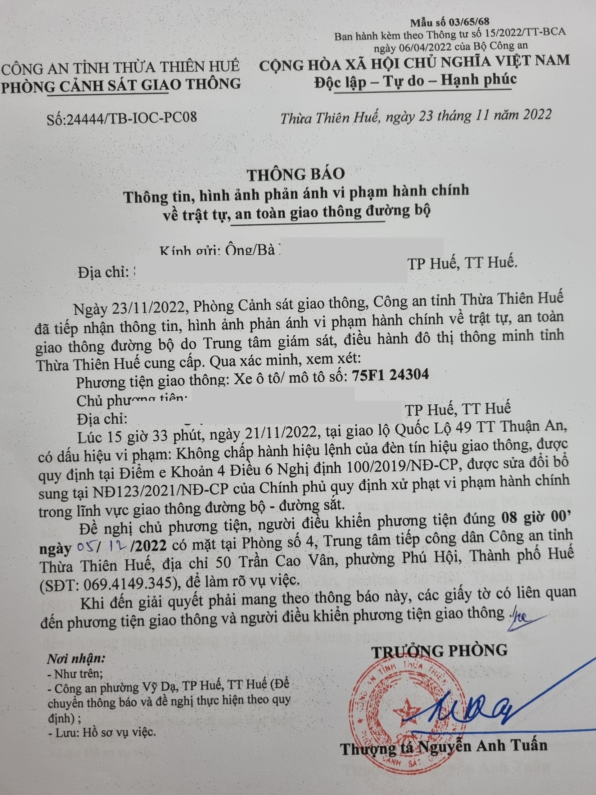 Phòng Cảnh sát giao thông xác định lỗi vi phạm của người điều khiển phương tiện 75F124304: Không chấp hành hiệu lệnh đèn tín hiệu giao thông, quy định tại điểm e, khoản 4, điều 6 Nghị định 100/2019/NĐ-CP được sửa đổi, bổ sung tại NĐ 123/2021/NĐ-CP.