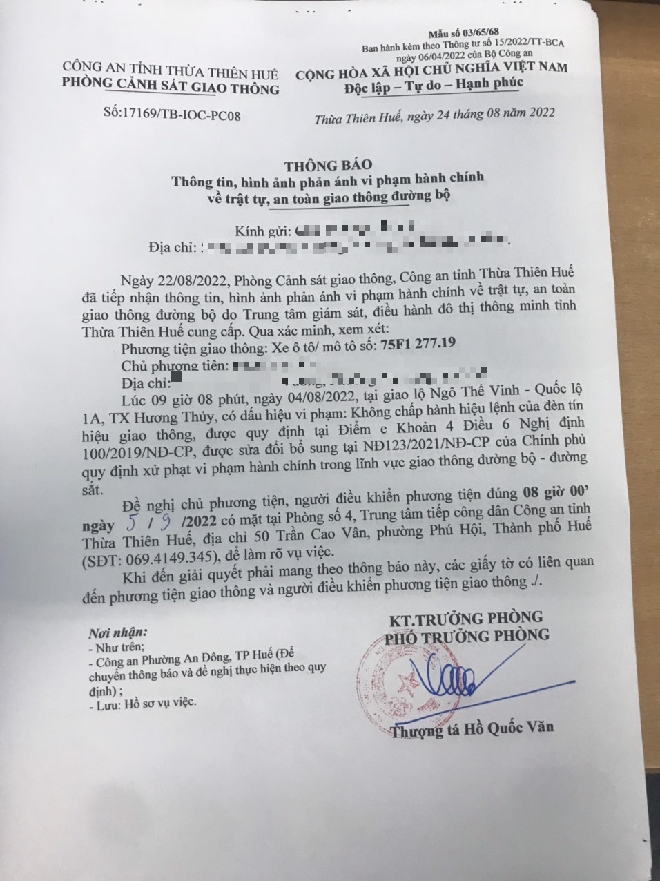 Vào lúc 09 giờ 08 phút, ngày 04/08/2022 Xe máy mang biển kiểm soát 75F127719 Không chấp hành hiệu lệnh của đèn tín hiệu giao thông tại địa điểm Ngô Thế Vinh - QL1A