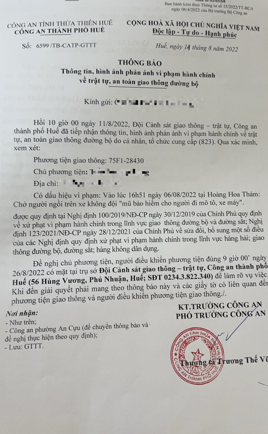 Vấn đề Ông/Bà phản ánh, Công an tỉnh đã chỉ đạo Công an thành phố Huế xin thông báo kết quả xử lý như sau:
