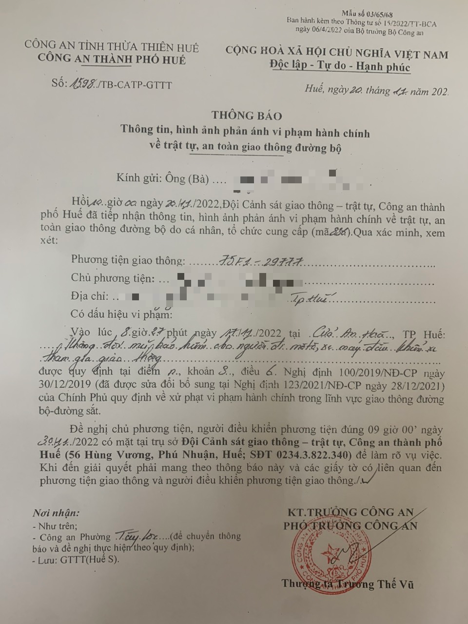 Công an thành phố đã lập hồ sơ, thông báo chủ phương tiện đến làm việc. Tuy nhiên, hiện chủ phương tiện vẫn chưa trình diện tại cơ quan. Công an thành phố Huế sẽ tiếp tục thông báo lực lượng tuần tra trên địa bàn, trong quá trình làm nhiệm vụ phát hiện, xử lý.