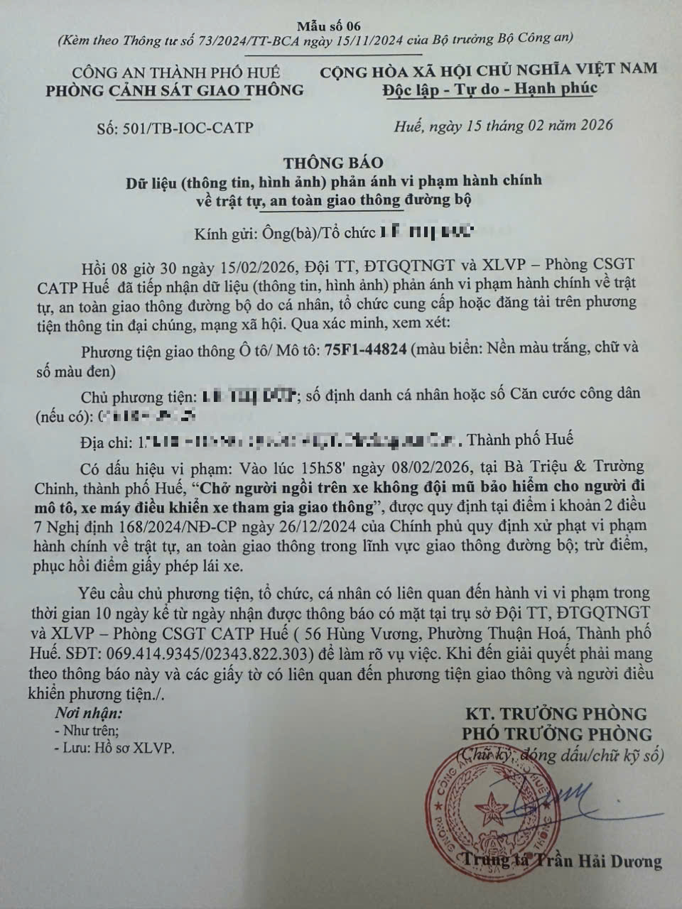 Qua hình ảnh phản ánh, Phòng Cảnh sát giao thông xác định lỗi vi phạm của người điều khiển phương tiện 75F144824 như sau: Chở người ngồi trên xe không đội mũ bảo hiểm cho người đi mô tô, xe máy điều khiển phương tiện tham gia giao thông, quy định tại điểm i, khoản 2, điều 7 Nghị định 168/2024/NĐ-CP.