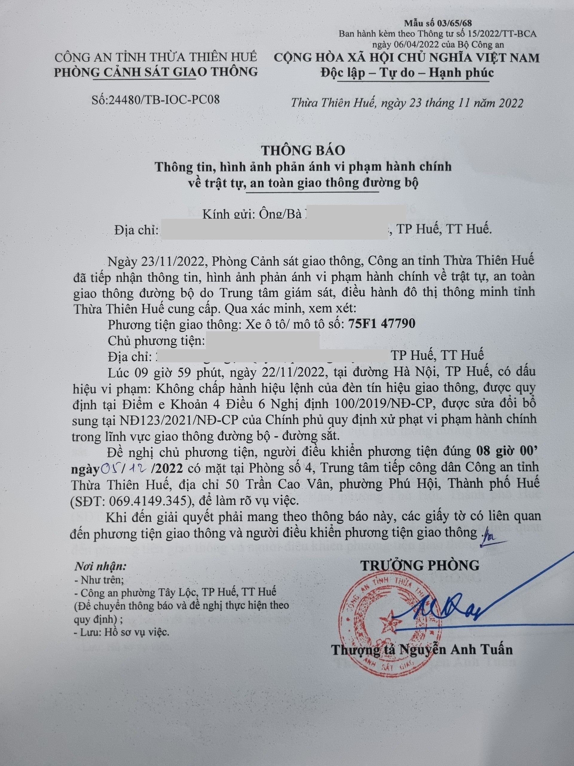 Phòng Cảnh sát giao thông xác định lỗi vi phạm của người điều khiển phương tiện 75F147790: Không chấp hành hiệu lệnh đèn tín hiệu giao thông, quy định tại điểm e, khoản 4, điều 6 Nghị định 100/2019/NĐ-CP được sửa đổi, bổ sung tại NĐ 123/2021/NĐ-CP.
