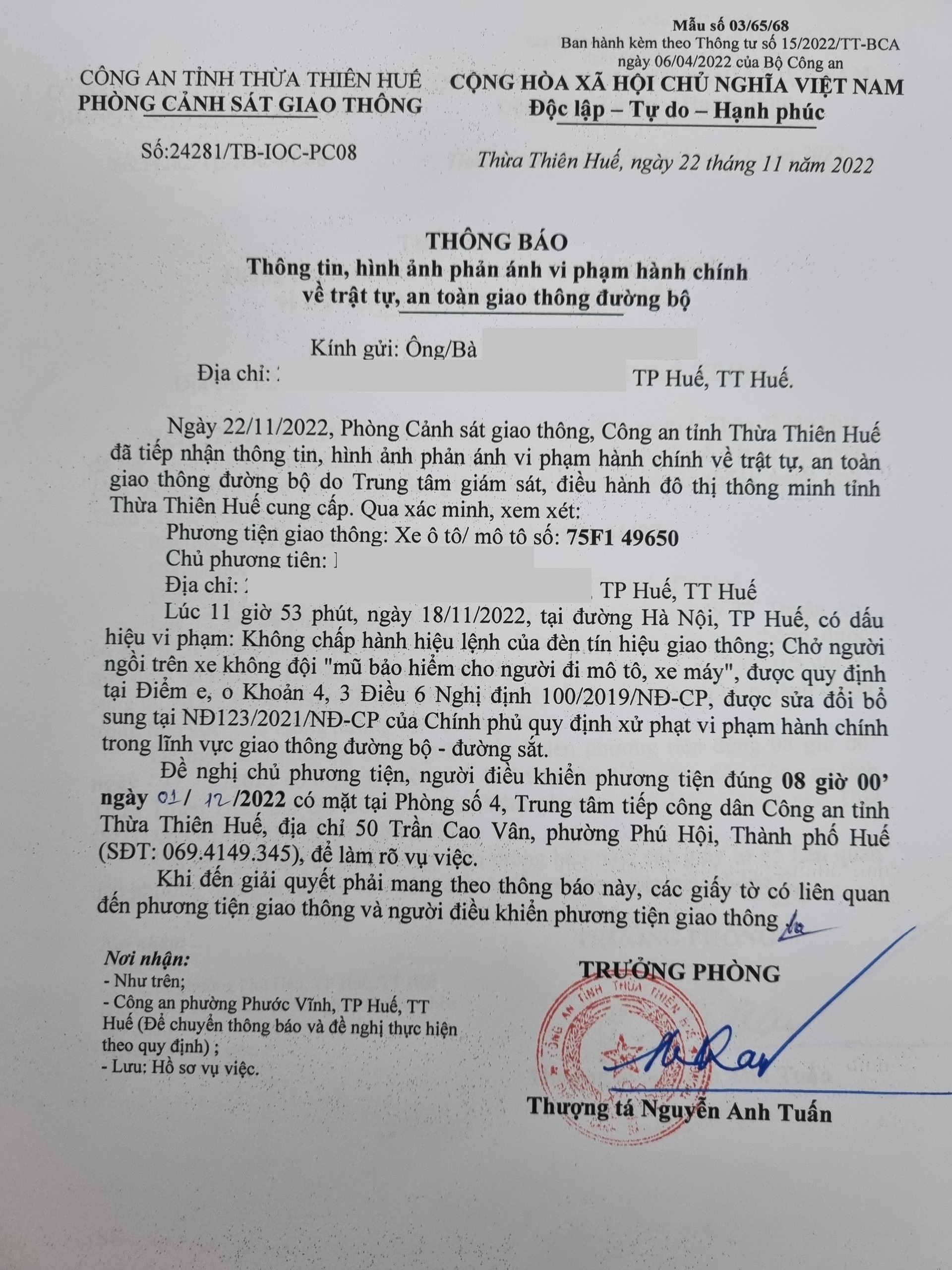 Phòng Cảnh sát giao thông xác định lỗi vi phạm của người điều khiển phương tiện 75F149650: Chở người ngồi trên xe không đội "mũ bảo hiểm cho người đi mô tô, xe máy"; Không chấp hành hiệu lệnh của đèn tín hiệu giao thông (quy định tại điểm o, khoản 3; điểm e, khoản 4, Điều 6 Nghị định 100/2019/NĐ-CP, sửa đổi bổ sung tại Nghị định 123/2021/NĐ-CP).