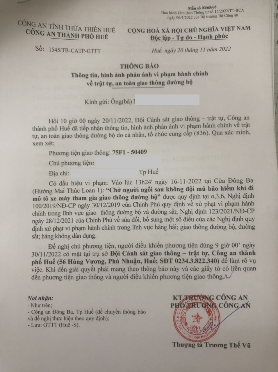 Vấn đề Ông/Bà phản ánh, Công an tỉnh đã chỉ đạo Công an thành phố Huế kiểm tra và xin thông báo kết quả xử lý như sau: