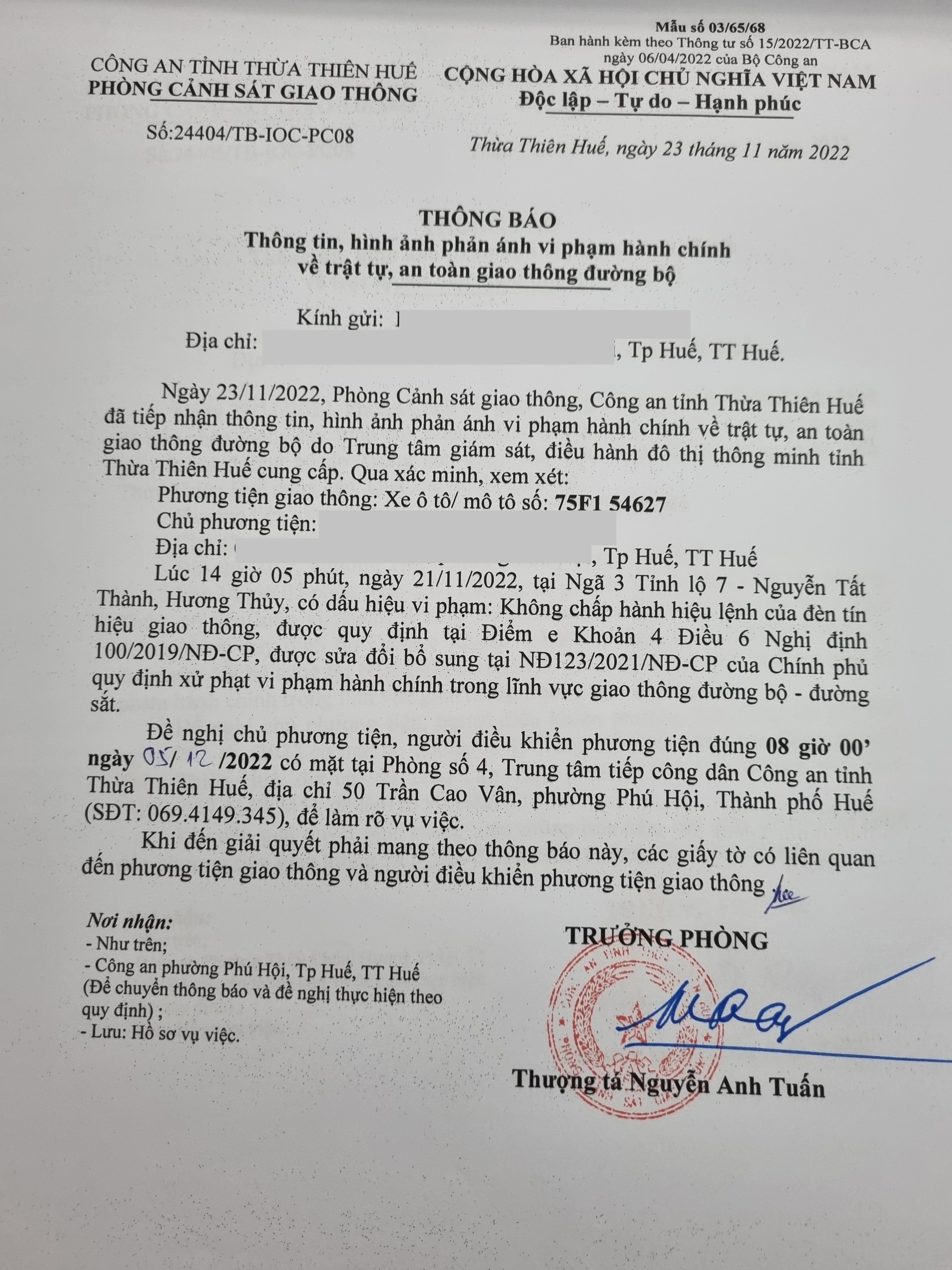 Phòng Cảnh sát giao thông xác định lỗi vi phạm của người điều khiển phương tiện 75F154627: Không chấp hành hiệu lệnh đèn tín hiệu giao thông, quy định tại điểm e, khoản 4, điều 6 Nghị định 100/2019/NĐ-CP được sửa đổi, bổ sung tại NĐ 123/2021/NĐ-CP.
