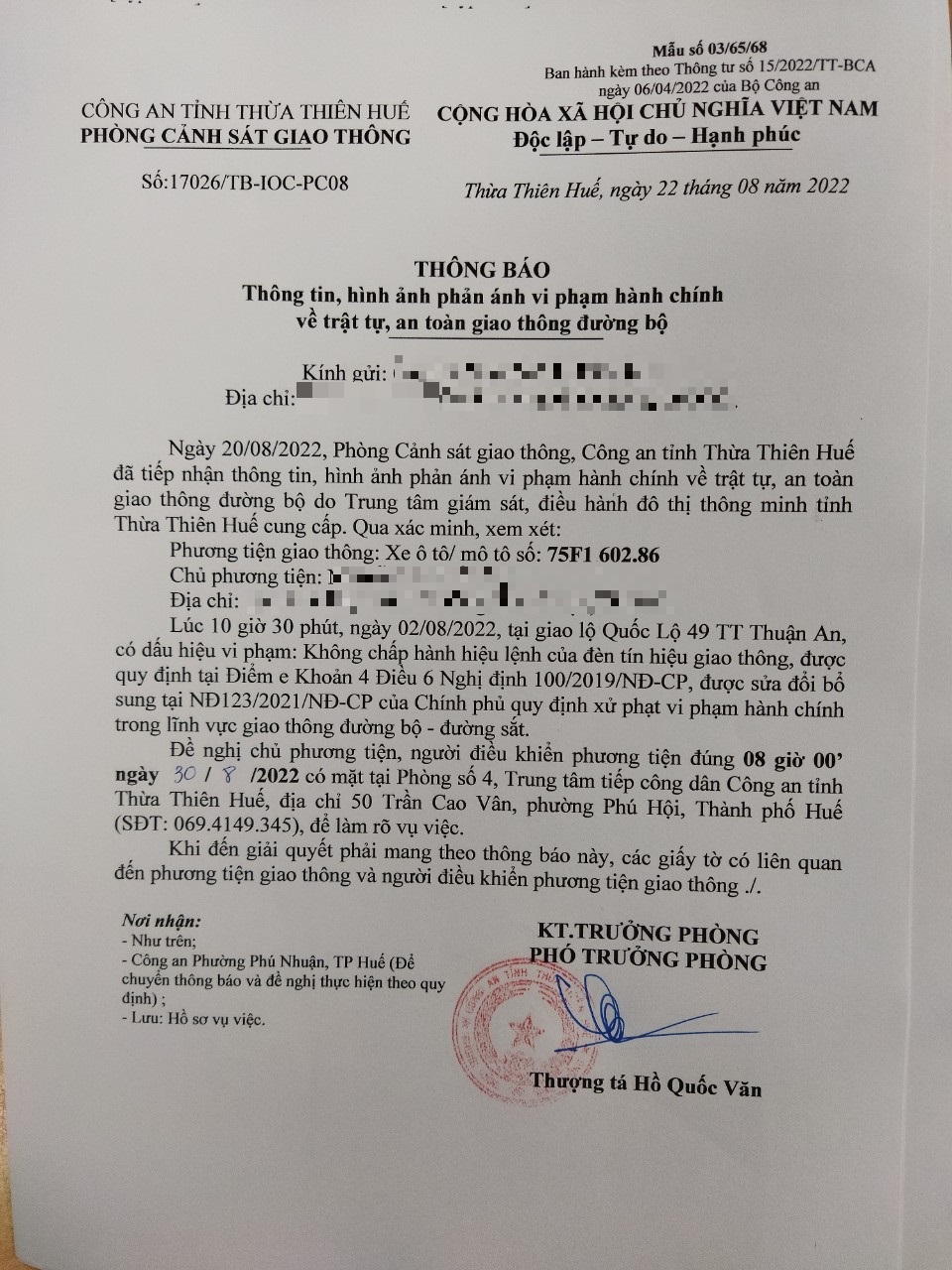 Vào lúc 10 giờ 30 phút, ngày 02/08/2022 Xe máy mang biển kiểm soát 75F160286 Không chấp hành hiệu lệnh của đèn tín hiệu giao thông tại địa điểm QL49 TT Thuận An