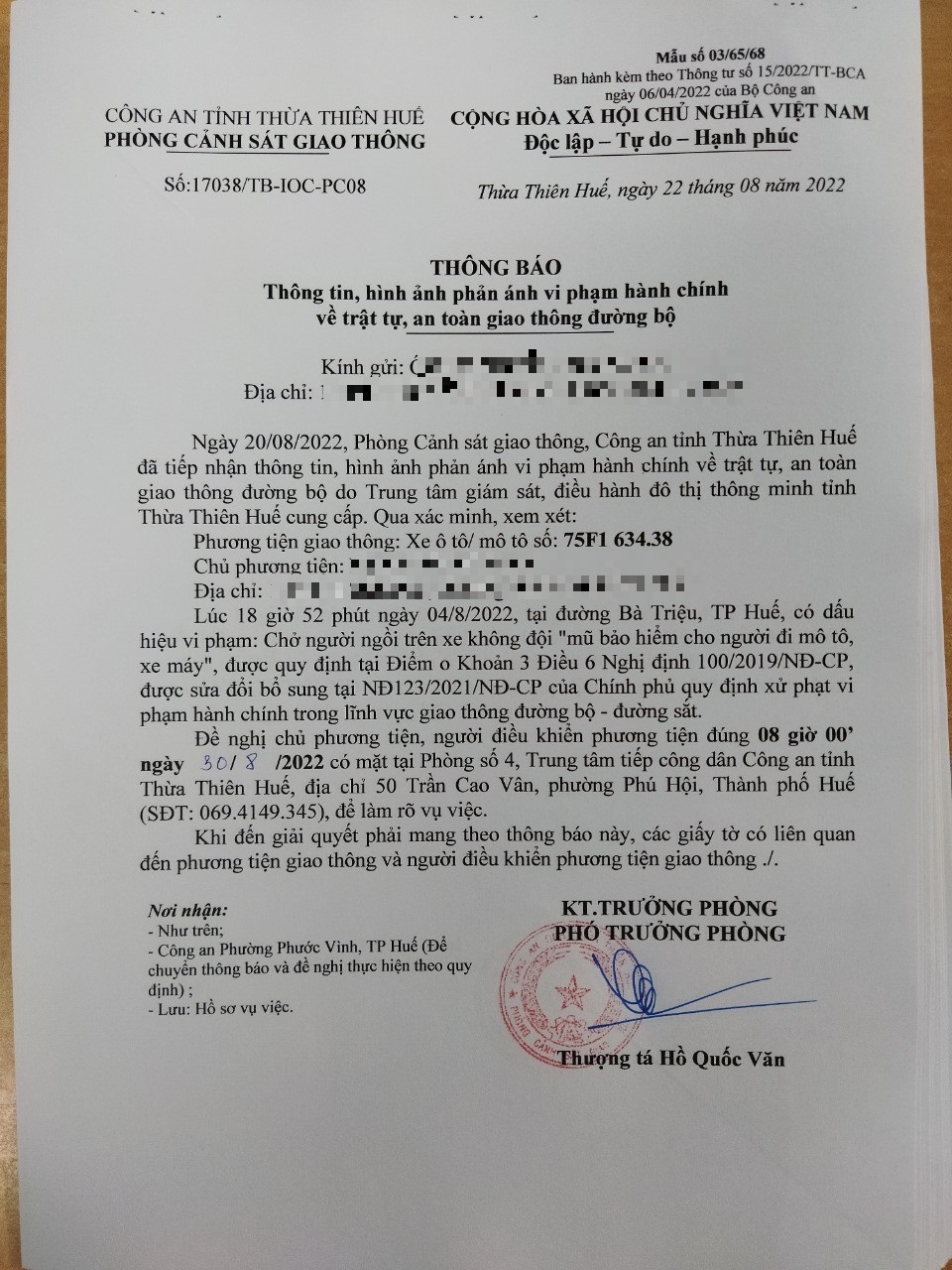 Phòng Cảnh sát giao thông xác định lỗi vi phạm của người điều khiển phương tiện: Chở người ngồi trên xe không đội "mũ bảo hiểm cho người đi mô tô, xe máy" (quy định tại điểm o, khoản 3, Điều 6 Nghị định 100/2019/NĐ-CP, sửa đổi bổ sung tại Nghị định 123/2021/NĐ-CP).