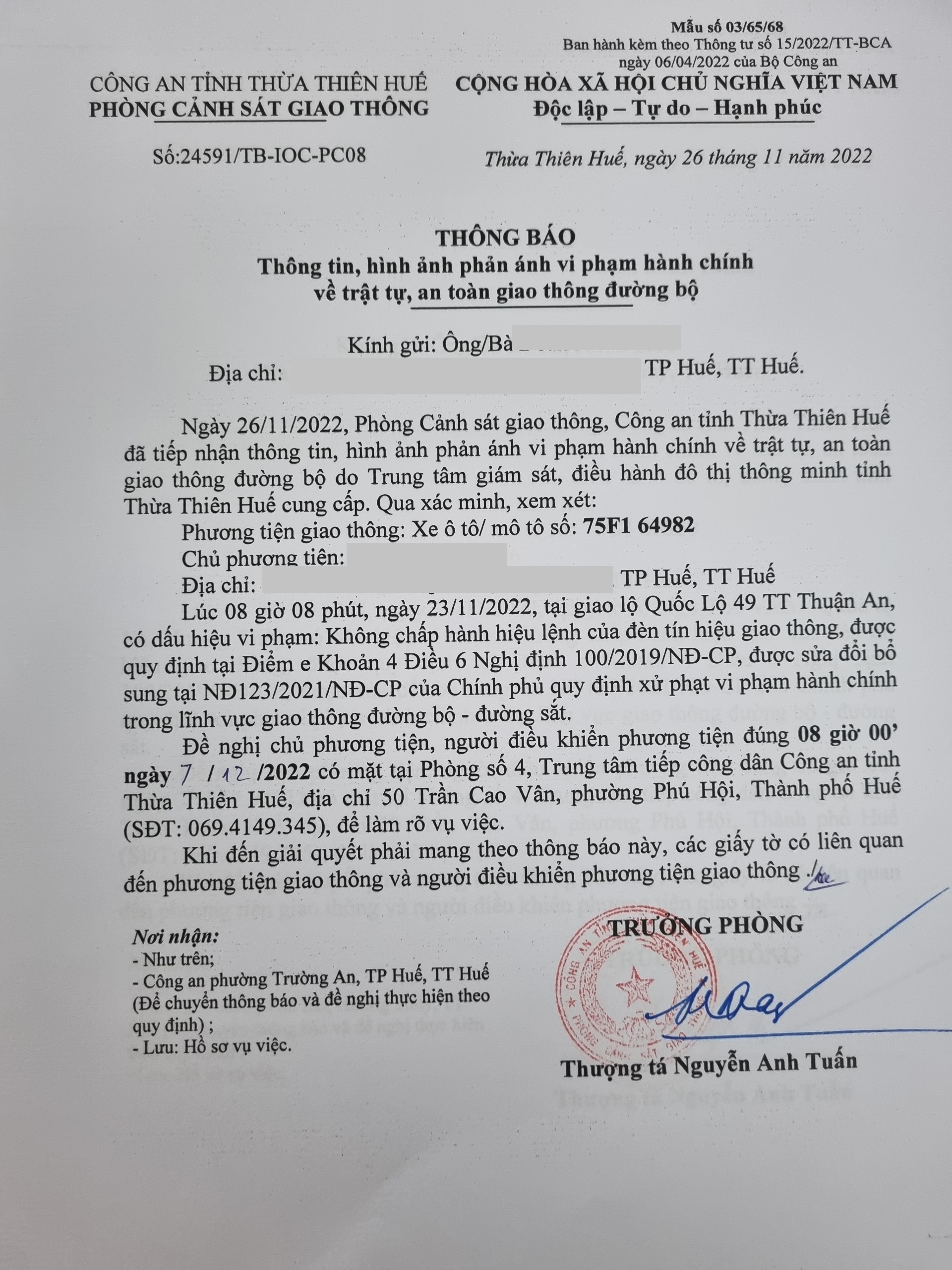 Phòng Cảnh sát giao thông xác định lỗi vi phạm của người điều khiển phương tiện 75F164982: Không chấp hành hiệu lệnh đèn tín hiệu giao thông, quy định tại điểm e, khoản 4, điều 6 Nghị định 100/2019/NĐ-CP được sửa đổi, bổ sung tại NĐ 123/2021/NĐ-CP.