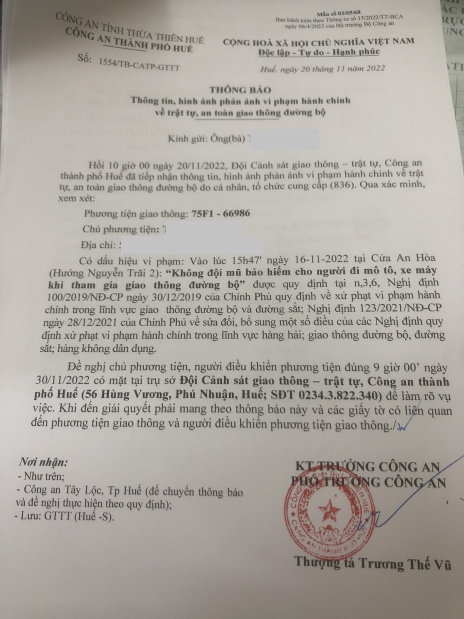 Vấn đề Ông/Bà phản ánh, Công an tỉnh đã chỉ đạo Công an thành phố Huế kiểm tra và xin thông báo kết quả xử lý như sau:
