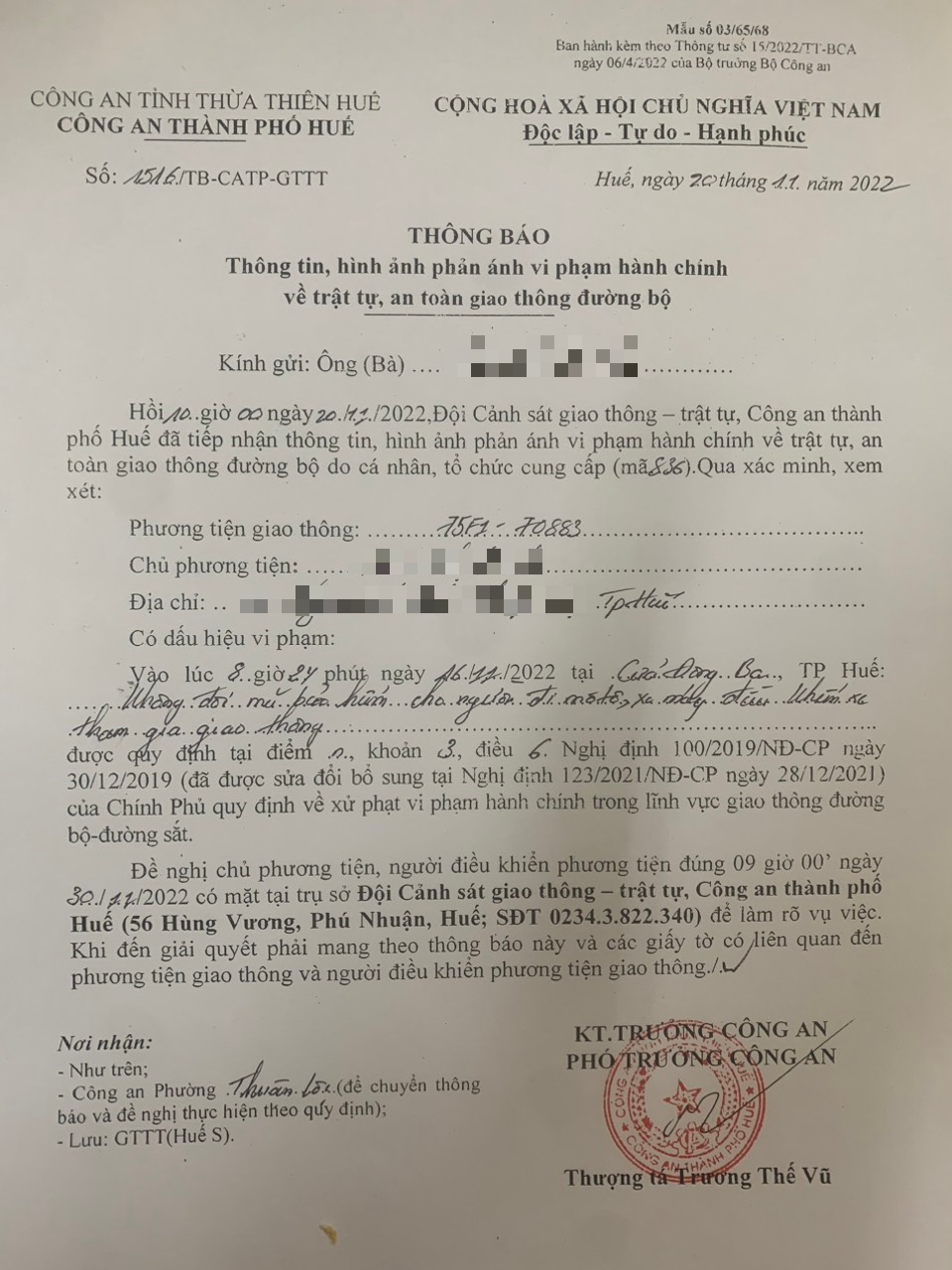 Vấn đề Ông/Bà phản ánh, Công an tỉnh đã chỉ đạo Công an thành phố Huế kiểm tra và xin thông báo kết quả xử lý như sau: