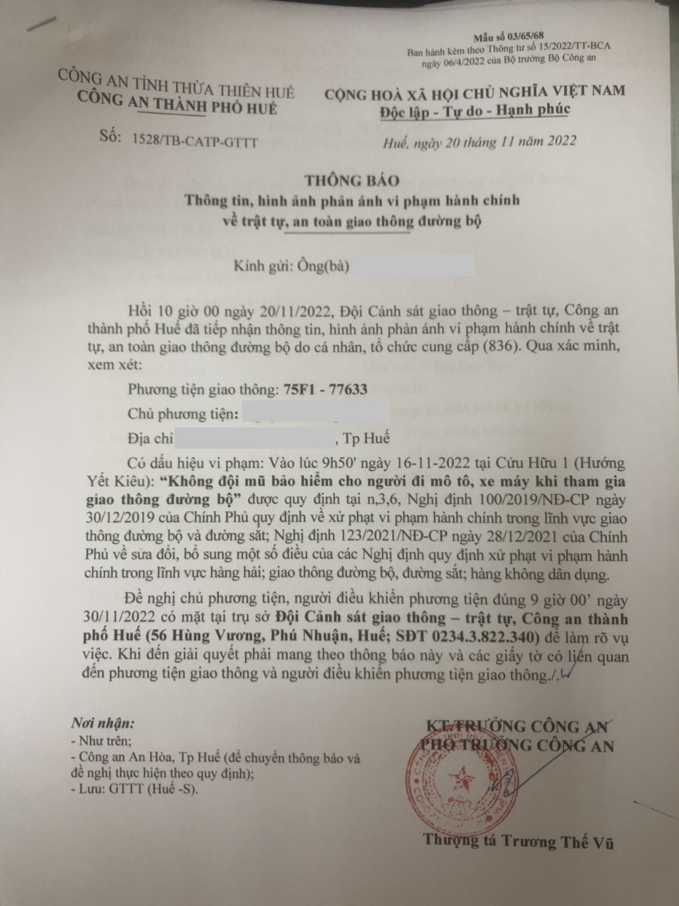 Vấn đề quý Ông/Bà phản ánh, Công an tỉnh đã chỉ đạo Công an thành phố Huế kiểm tra và xin thông báo kết quả xử lý như sau: