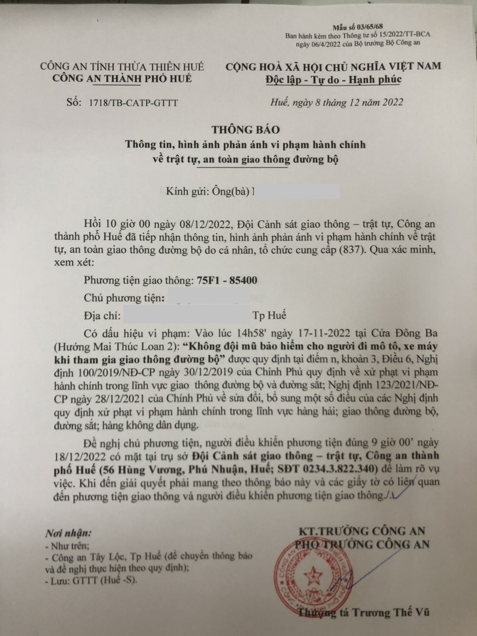 Qua hình ảnh được cung cấp, xác định người điều khiển phương tiện 75F185400 vi phạm lỗi: Không đội "mũ bảo hiểm cho người đi mô tô, xe máy” (quy định tại điểm n khoản 3, Điều 6 Nghị định 100/2019/NĐ-CP, sửa đổi bổ sung tại Nghị định 123/2021/NĐ-CP). Công an thành phố Huế đã gửi thông báo, yêu cầu chủ phương tiện đến làm việc theo quy định. Tuy nhiên, hiện chủ phương tiện vẫn chưa trình diện tại cơ quan. Công an thành phố Huế sẽ tiếp tục thông báo các tổ tuần tra kiểm soát trên địa bàn, trong quá trình làm nhiệm vụ nếu phát hiện sẽ tiến hành dừng xe để xử lý.