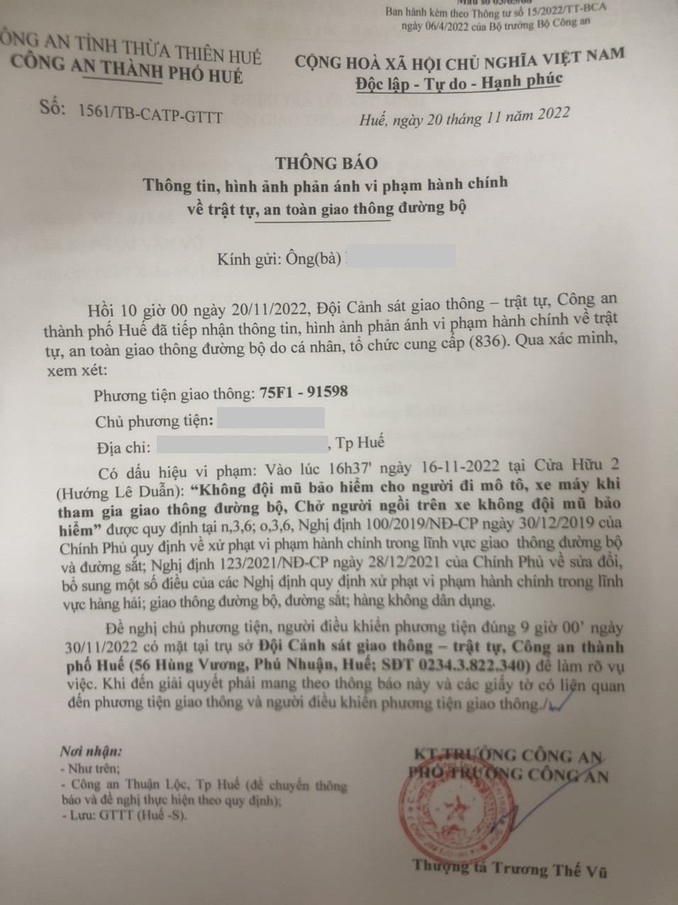 Vấn đề Ông/Bà phản ánh, Công an tỉnh đã chỉ đạo Công an thành phố Huế kiểm tra và xin thông báo kết quả xử lý như sau: