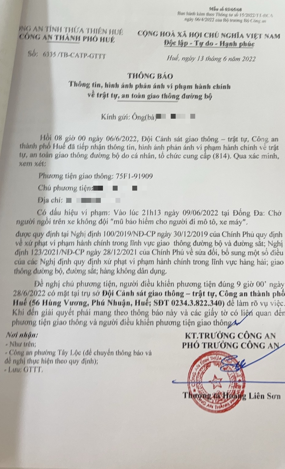 Công an thành phố đã lập hồ sơ, thông báo chủ phương tiện đến làm việc vào ngày 28/6/2022. Tuy nhiên, hiện chủ phương tiện vẫn chưa trình diện tại cơ quan. Công an thành phố Huế sẽ tiếp tục thông báo lực lượng tuần tra trên địa bàn, trong quá trình làm nhiệm vụ phát hiện, xử lý.