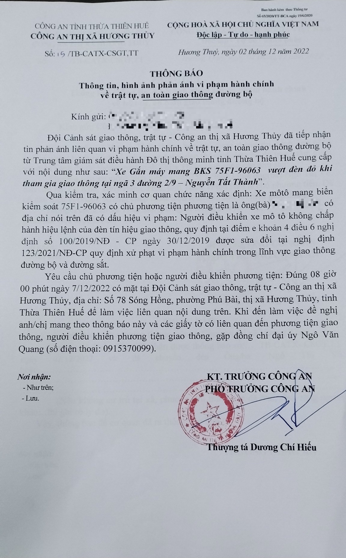 Vấn đề quý Ông/Bà phản ánh, Công an tỉnh đã chỉ đạo Công an thị xã Hương Thuỷ kiểm tra và xin thông báo kết quả xử lý như sau: