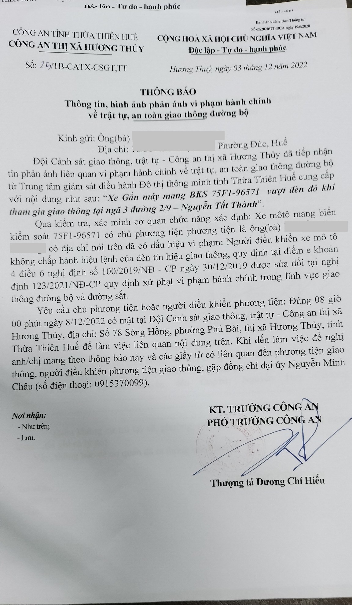 Vấn đề Ông/Bà phản ánh, Công an tỉnh đã chỉ đạo Công an thị xã Hương Thủy xin thông báo kết quả xử lý như sau: