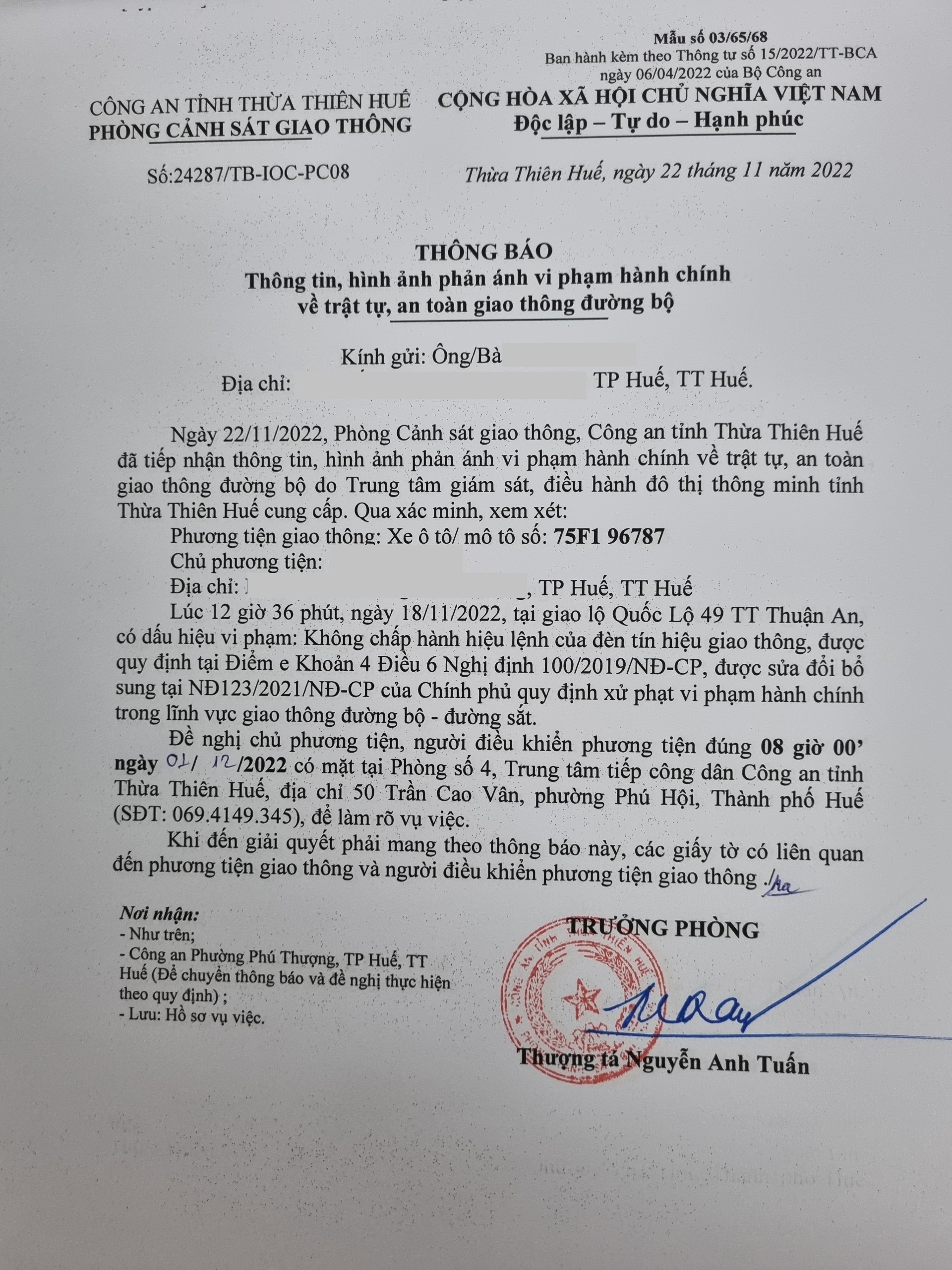 Phòng Cảnh sát giao thông xác định lỗi vi phạm của người điều khiển phương tiện 75F196787: Không chấp hành hiệu lệnh đèn tín hiệu giao thông, quy định tại điểm e, khoản 4, điều 6 Nghị định 100/2019/NĐ-CP được sửa đổi, bổ sung tại NĐ 123/2021/NĐ-CP.