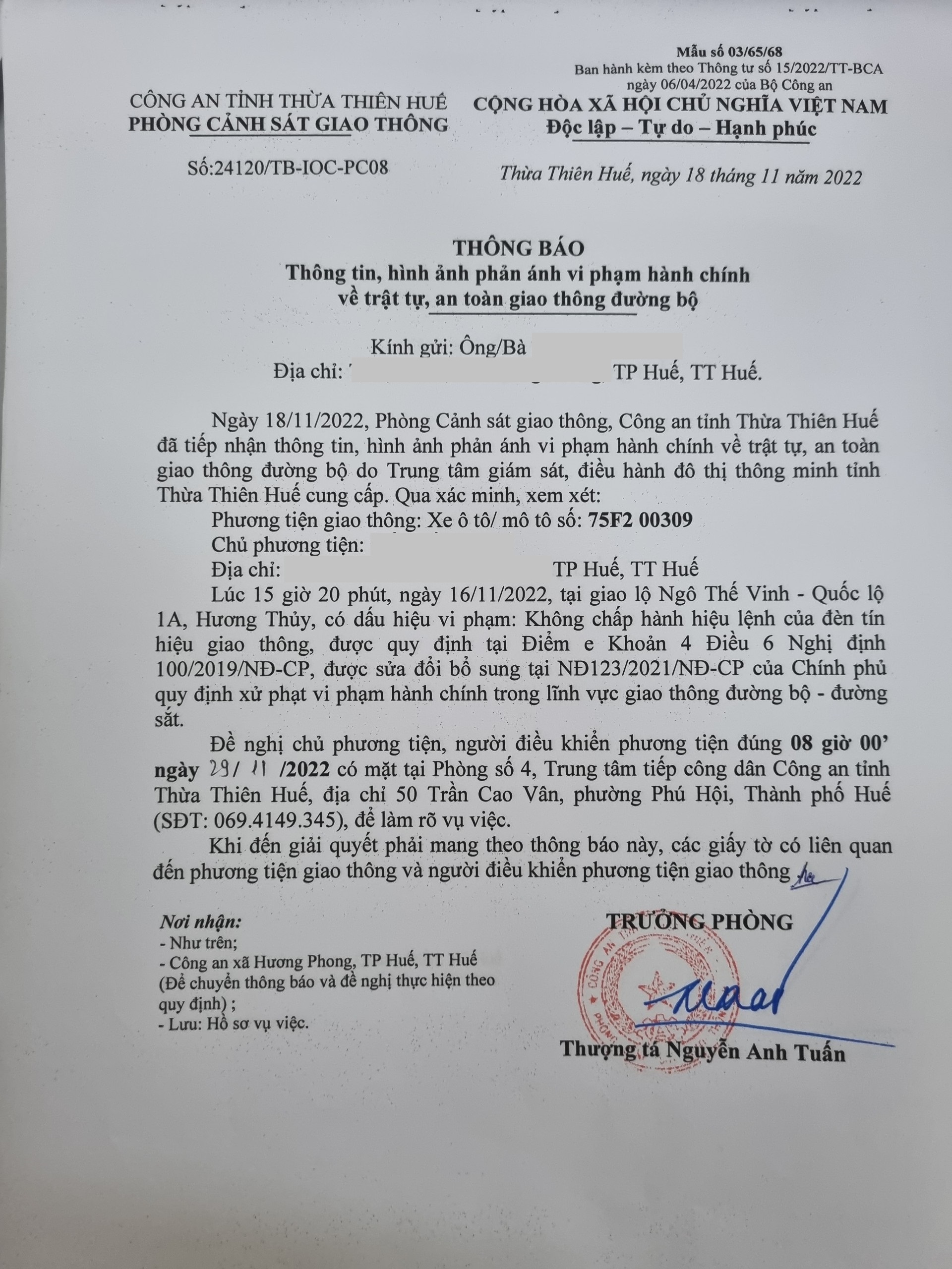 Phòng Cảnh sát giao thông xác định lỗi vi phạm của người điều khiển phương tiện 75F200309: Không chấp hành hiệu lệnh đèn tín hiệu giao thông, quy định tại điểm e, khoản 4, điều 6 Nghị định 100/2019/NĐ-CP được sửa đổi, bổ sung tại NĐ 123/2021/NĐ-CP.